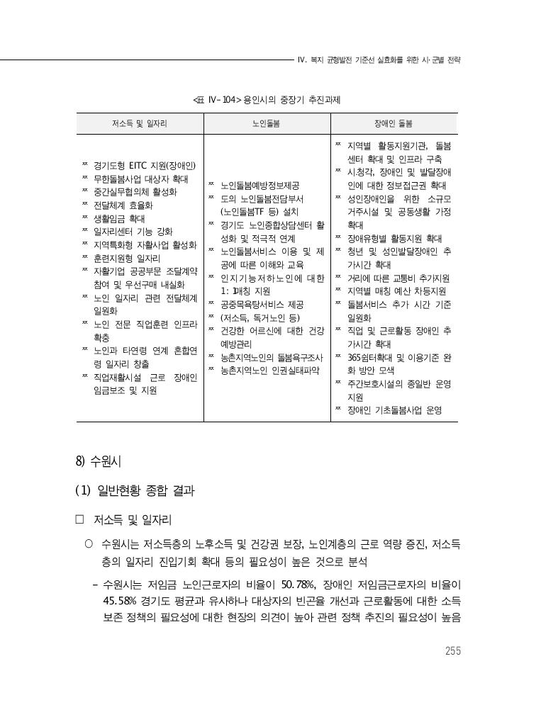 Ⅳ. 복지 균형발전 기준선 실효화를 위한 시·군별 전략 255 저소득 및 일자리 노인돌봄 장애인 돌봄  경기도형 EITC 지원(장애인)  무한돌봄사업 대상자 확대  중간실무협의체 활성화  전달체계 효율화  생활임금 확대  일자리센터 기능 강화  지역특화형 자활사업 활성화  훈련지원형 일자리  자활기업 공공부문 조달계약 참여 및 우선구매 내실화  노인 일자리 관련 전달체계 일원화  노인 전문 직업훈련 인프라 확충  노인과 타연령 연계 혼합연 령 일자리 창출  직업재활시설 근로 장애인 임금보조 및 지원  노인돌봄예방정보제공  도의 노인돌봄전담부서 (노인돌봄TF 등) 설치  경기도 노인종합상담센터 활 성화 및 적극적 연계  노인돌봄서비스 이용 및 제 공에 따른 이해와 교육  인지기능저하노인에 대한 1:1매칭 지원  공중목욕탕서비스 제공  (저소득, 독거노인 등)  건강한 어르신에 대한 건강 예방관리  농촌지역노인의 돌봄욕구조사  농촌지역노인 인권실태파악  지역별 활동지원기관, 돌봄 센터 확대 및 인프라 구축  시․청각, 장애인 및 발달장애 인에 대한 정보접근권 확대  성인장애인을 위한 소규모 거주시설 및 공동생활 가정 확대  장애유형별 활동지원 확대  청년 및 성인발달장애인 추 가시간 확대  거리에 따른 교통비 추가지원  지역별 매칭 예산 차등지원  돌봄서비스 추가 시간 기준 일원화  직업 및 근로활동 장애인 추 가시간 확대  365쉼터확대 및 이용기준 완 화 방안 모색  주간보호시설의 종일반 운영 지원  장애인 기초돌봄사업 운영 <표 Ⅳ-104> 용인시의 중장기 추진과제 8) 수원시 (1) 일반현황 종합 결과 □ 저소득 및 일자리 ○ 수원시는 저소득층의 노후소득 및 건강권 보장, 노인계층의 근로 역량 증진, 저소득 층의 일자리 진입기회 확대 등의 필요성이 높은 것으로 분석 - 수원시는 저임금 노인근로자의 비율이 50.78%, 장애인 저임금근로자의 비율이 45.58% 경기도 평균과 유사하나 대상자의 빈곤율 개선과 근로활동에 대한 소득 보존 정책의 필요성에 대한 현장의 의견이 높아 관련 정책 추진의 필요성이 높음