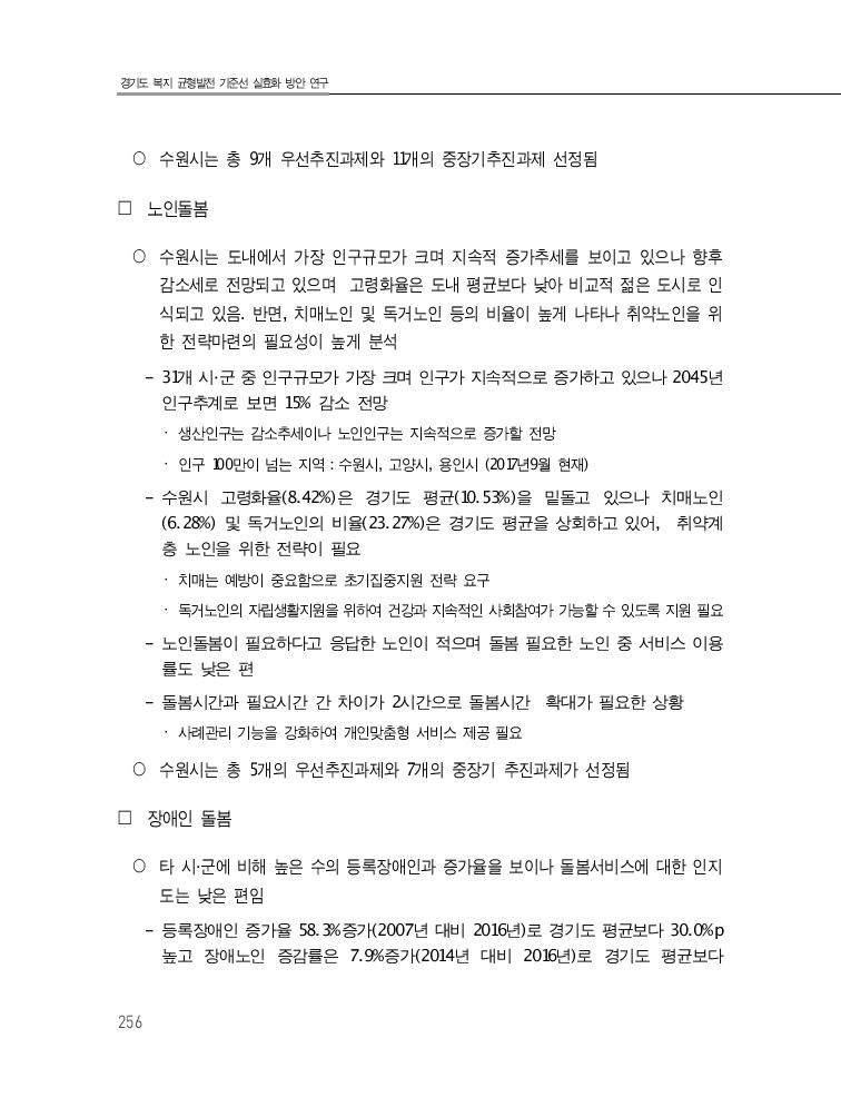 경기도 복지 균형발전 기준선 실효화 방안 연구 256 ○ 수원시는 총 9개 우선추진과제와 11개의 중장기추진과제 선정됨 □ 노인돌봄 ○ 수원시는 도내에서 가장 인구규모가 크며 지속적 증가추세를 보이고 있으나 향후 감소세로 전망되고 있으며 고령화율은 도내 평균보다 낮아 비교적 젊은 도시로 인 식되고 있음. 반면, 치매노인 및 독거노인 등의 비율이 높게 나타나 취약노인을 위 한 전략마련의 필요성이 높게 분석 - 31개 시·군 중 인구규모가 가장 크며 인구가 지속적으로 증가하고 있으나 2045년 인구추계로 보면 15% 감소 전망 ・ 생산인구는 감소추세이나 노인인구는 지속적으로 증가할 전망 ・ 인구 100만이 넘는 지역:수원시, 고양시, 용인시 (2017년9월 현재) - 수원시 고령화율(8.42%)은 경기도 평균(10.53%)을 밑돌고 있으나 치매노인 (6.28%) 및 독거노인의 비율(23.27%)은 경기도 평균을 상회하고 있어, 취약계 층 노인을 위한 전략이 필요 ・ 치매는 예방이 중요함으로 초기집중지원 전략 요구 ・ 독거노인의 자립생활지원을 위하여 건강과 지속적인 사회참여가 가능할 수 있도록 지원 필요 - 노인돌봄이 필요하다고 응답한 노인이 적으며 돌봄 필요한 노인 중 서비스 이용 률도 낮은 편 - 돌봄시간과 필요시간 간 차이가 2시간으로 돌봄시간 확대가 필요한 상황 ・ 사례관리 기능을 강화하여 개인맞춤형 서비스 제공 필요 ○ 수원시는 총 5개의 우선추진과제와 7개의 중장기 추진과제가 선정됨 □ 장애인 돌봄 ○ 타 시·군에 비해 높은 수의 등록장애인과 증가율을 보이나 돌봄서비스에 대한 인지 도는 낮은 편임 - 등록장애인 증가율 58.3%증가(2007년 대비 2016년)로 경기도 평균보다 30.0%p 높고 장애노인 증감률은 7.9%증가(2014년 대비 2016년)로 경기도 평균보다