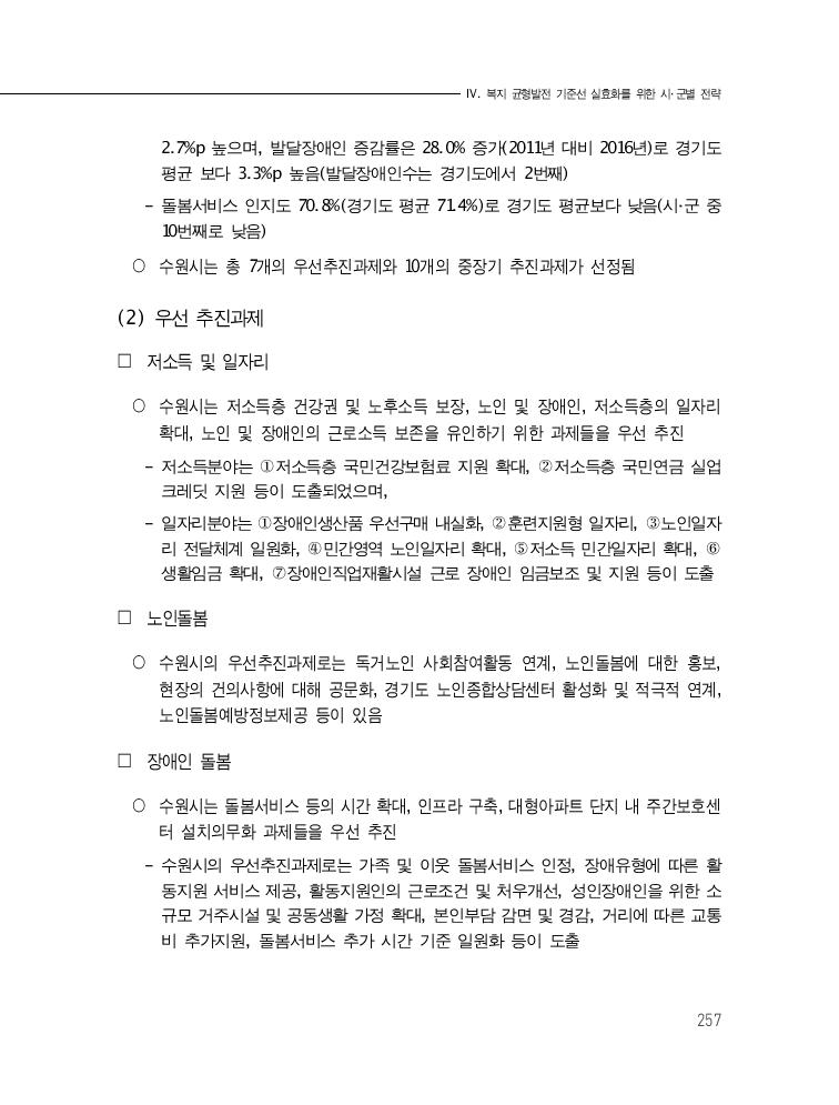 Ⅳ. 복지 균형발전 기준선 실효화를 위한 시·군별 전략 257 2.7%p 높으며, 발달장애인 증감률은 28.0% 증가(2011년 대비 2016년)로 경기도 평균 보다 3.3%p 높음(발달장애인수는 경기도에서 2번째) - 돌봄서비스 인지도 70.8%(경기도 평균 71.4%)로 경기도 평균보다 낮음(시·군 중 10번째로 낮음) ○ 수원시는 총 7개의 우선추진과제와 10개의 중장기 추진과제가 선정됨 (2) 우선 추진과제 □ 저소득 및 일자리 ○ 수원시는 저소득층 건강권 및 노후소득 보장, 노인 및 장애인, 저소득층의 일자리 확대, 노인 및 장애인의 근로소득 보존을 유인하기 위한 과제들을 우선 추진 - 저소득분야는 ①저소득층 국민건강보험료 지원 확대, ②저소득층 국민연금 실업 크레딧 지원 등이 도출되었으며, - 일자리분야는 ①장애인생산품 우선구매 내실화, ②훈련지원형 일자리, ③노인일자 리 전달체계 일원화, ④민간영역 노인일자리 확대, ⑤저소득 민간일자리 확대, ⑥ 생활임금 확대, ⑦장애인직업재활시설 근로 장애인 임금보조 및 지원 등이 도출 □ 노인돌봄 ○ 수원시의 우선추진과제로는 독거노인 사회참여활동 연계, 노인돌봄에 대한 홍보, 현장의 건의사항에 대해 공문화, 경기도 노인종합상담센터 활성화 및 적극적 연계, 노인돌봄예방정보제공 등이 있음 □ 장애인 돌봄 ○ 수원시는 돌봄서비스 등의 시간 확대, 인프라 구축, 대형아파트 단지 내 주간보호센 터 설치의무화 과제들을 우선 추진 - 수원시의 우선추진과제로는 가족 및 이웃 돌봄서비스 인정, 장애유형에 따른 활 동지원 서비스 제공, 활동지원인의 근로조건 및 처우개선, 성인장애인을 위한 소 규모 거주시설 및 공동생활 가정 확대, 본인부담 감면 및 경감, 거리에 따른 교통 비 추가지원, 돌봄서비스 추가 시간 기준 일원화 등이 도출