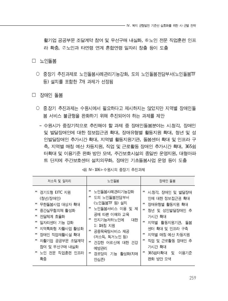 Ⅳ. 복지 균형발전 기준선 실효화를 위한 시·군별 전략 259 저소득 및 일자리 노인돌봄 장애인 돌봄  경기도형 EITC 지원 (청년/장애인)  무한돌봄사업 대상자 확대  중간실무협의체 활성화  전달체계 효율화  일자리센터 기능 강화  지역특화형 자활사업 활성화  장애인 직업재활시설 확대  자활기업 공공부문 조달계약 참여 및 우선구매 내실화  노인 전문 직업훈련 인프라 확충  노인돌봄사례관리기능강화  도의 노인돌봄전담부서 (노인돌봄TF 등) 설치  노인돌봄서비스 이용 및 제 공에 따른 이해와 교육  인지기능저하노인에 대한 1:1매칭 지원  공중목욕탕서비스 제공 (저소득, 독거노인 등)  건강한 어르신에 대한 건강 예방관리  경로당의 기능 활성화(치매 안심존)  시․청각, 장애인 및 발달장애 인에 대한 정보접근권 확대  장애유형별 활동지원 확대  청년 및 성인발달장애인 추 가시간 확대  지역별 활동지원기관, 돌봄 센터 확대 및 인프라 구축  지역별 매칭 예산 차등지원  직업 및 근로활동 장애인 추 가시간 확대  365쉼터확대 및 이용기준 완화 방안 모색 <표 Ⅳ-106> 수원시의 중장기 추진과제 활기업 공공부문 조달계약 참여 및 우선구매 내실화, ⑥노인 전문 직업훈련 인프 라 확충, ⑦노인과 타연령 연계 혼합연령 일자리 창출 등이 도출 □ 노인돌봄 ○ 중장기 추진과제로 노인돌봄사례관리기능강화, 도의 노인돌봄전담부서(노인돌봄TF 등) 설치를 포함한 7개 과제가 선정됨 □ 장애인 돌봄 ○ 중․장기 추진과제는 수원시에서 필요하다고 제시하지는 않았지만 지역별 장애인돌 봄 서비스 불균형을 완화하기 위해 추진되어야 하는 과제를 제안 - 수원시가 중장기적으로 추진해야 할 과제 중 장애인돌봄분야는 시․청각, 장애인 및 발달장애인에 대한 정보접근권 확대, 장애유형별 활동지원 확대, 청년 및 성 인발달장애인 추가시간 확대, 지역별 활동지원기관, 돌봄센터 확대 및 인프라 구 축, 지역별 매칭 예산 차등지원, 직업 및 근로활동 장애인 추가시간 확대, 365쉼 터확대 및 이용기준 완화 방안 모색, 주간보호시설의 종일반 운영지원, 대형아파 트 단지에 주간보호센터 설치의무화, 장애인 기초돌봄사업 운영 등이 도출