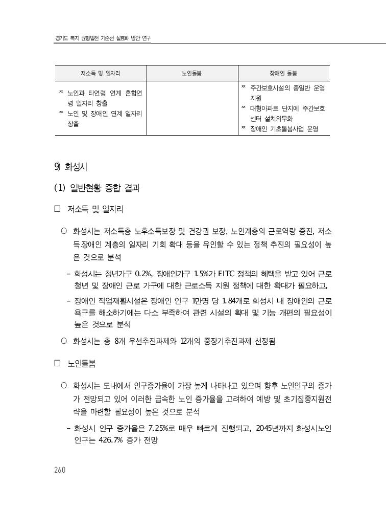 경기도 복지 균형발전 기준선 실효화 방안 연구 260 저소득 및 일자리 노인돌봄 장애인 돌봄  노인과 타연령 연계 혼합연 령 일자리 창출  노인 및 장애인 연계 일자리 창출  주간보호시설의 종일반 운영 지원  대형아파트 단지에 주간보호 센터 설치의무화  장애인 기초돌봄사업 운영 9) 화성시 (1) 일반현황 종합 결과 □ 저소득 및 일자리 ○ 화성시는 저소득층 노후소득보장 및 건강권 보장, 노인계층의 근로역량 증진, 저소 득․장애인 계층의 일자리 기회 확대 등을 유인할 수 있는 정책 추진의 필요성이 높 은 것으로 분석 - 화성시는 청년가구 0.2%, 장애인가구 1.5%가 EITC 정책의 혜택을 받고 있어 근로 청년 및 장애인 근로 가구에 대한 근로소득 지원 정책에 대한 확대가 필요하고, - 장애인 직업재활시설은 장애인 인구 1만명 당 1.84개로 화성시 내 장애인의 근로 욕구를 해소하기에는 다소 부족하여 관련 시설의 확대 및 기능 개편의 필요성이 높은 것으로 분석 ○ 화성시는 총 8개 우선추진과제와 12개의 중장기추진과제 선정됨 □ 노인돌봄 ○ 화성시는 도내에서 인구증가율이 가장 높게 나타나고 있으며 향후 노인인구의 증가 가 전망되고 있어 이러한 급속한 노인 증가율을 고려하여 예방 및 초기집중지원전 략을 마련할 필요성이 높은 것으로 분석 - 화성시 인구 증가율은 7.25%로 매우 빠르게 진행되고, 2045년까지 화성시노인 인구는 426.7% 증가 전망