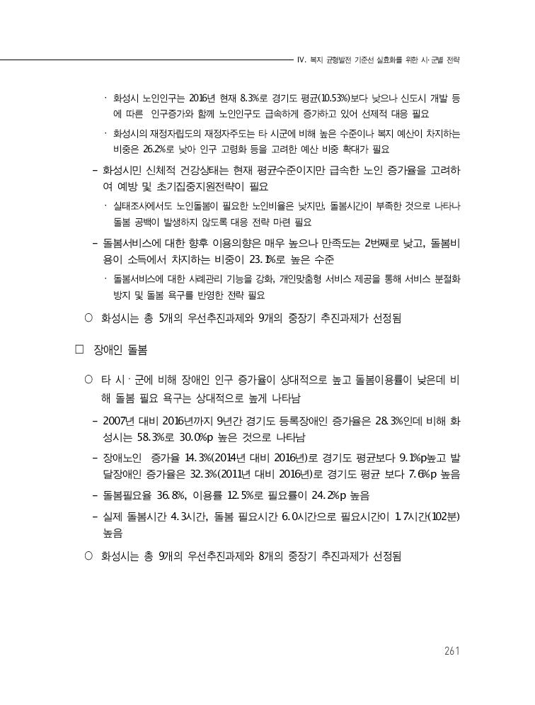 Ⅳ. 복지 균형발전 기준선 실효화를 위한 시·군별 전략 261 ・ 화성시 노인인구는 2016년 현재 8.3%로 경기도 평균(10.53%)보다 낮으나 신도시 개발 등 에 따른 인구증가와 함께 노인인구도 급속하게 증가하고 있어 선제적 대응 필요 ・ 화성시의 재정자립도의 재정자주도는 타 시군에 비해 높은 수준이나 복지 예산이 차지하는 비중은 26.2%로 낮아 인구 고령화 등을 고려한 예산 비중 확대가 필요 - 화성시민 신체적 건강상태는 현재 평균수준이지만 급속한 노인 증가율을 고려하 여 예방 및 초기집중지원전략이 필요 ・ 실태조사에서도 노인돌봄이 필요한 노인비율은 낮지만, 돌봄시간이 부족한 것으로 나타나 돌봄 공백이 발생하지 않도록 대응 전략 마련 필요 - 돌봄서비스에 대한 향후 이용의향은 매우 높으나 만족도는 2번째로 낮고, 돌봄비 용이 소득에서 차지하는 비중이 23.1%로 높은 수준 ・ 돌봄서비스에 대한 사례관리 기능을 강화, 개인맞춤형 서비스 제공을 통해 서비스 분절화 방지 및 돌봄 욕구를 반영한 전략 필요 ○ 화성시는 총 5개의 우선추진과제와 9개의 중장기 추진과제가 선정됨 □ 장애인 돌봄 ○ 타 시ㆍ군에 비해 장애인 인구 증가율이 상대적으로 높고 돌봄이용률이 낮은데 비 해 돌봄 필요 욕구는 상대적으로 높게 나타남 - 2007년 대비 2016년까지 9년간 경기도 등록장애인 증가율은 28.3%인데 비해 화 성시는 58.3%로 30.0%p 높은 것으로 나타남 - 장애노인 증가율 14.3%(2014년 대비 2016년)로 경기도 평균보다 9.1%p높고 발 달장애인 증가율은 32.3%(2011년 대비 2016년)로 경기도 평균 보다 7.6%p 높음 - 돌봄필요율 36.8%, 이용률 12.5%로 필요률이 24.2%p 높음 - 실제 돌봄시간 4.3시간, 돌봄 필요시간 6.0시간으로 필요시간이 1.7시간(102분) 높음 ○ 화성시는 총 9개의 우선추진과제와 8개의 중장기 추진과제가 선정됨