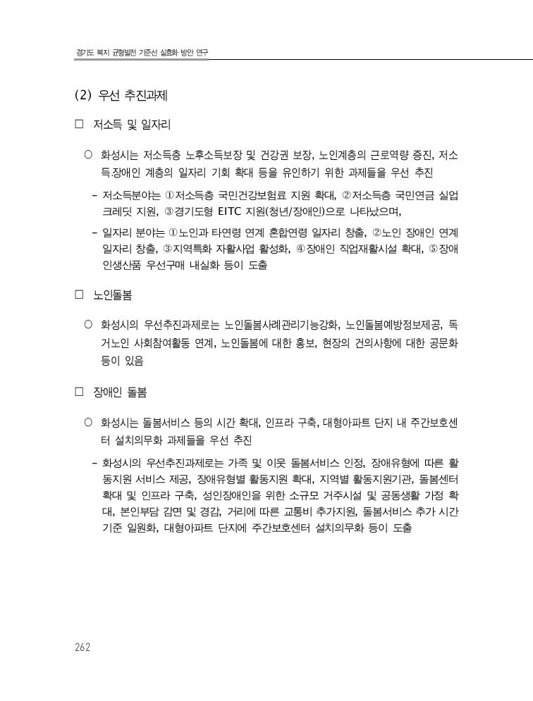경기도 복지 균형발전 기준선 실효화 방안 연구 262 (2) 우선 추진과제 □ 저소득 및 일자리 ○ 화성시는 저소득층 노후소득보장 및 건강권 보장, 노인계층의 근로역량 증진, 저소 득․장애인 계층의 일자리 기회 확대 등을 유인하기 위한 과제들을 우선 추진 - 저소득분야는 ①저소득층 국민건강보험료 지원 확대, ②저소득층 국민연금 실업 크레딧 지원, ③경기도형 EITC 지원(청년/장애인)으로 나타났으며, - 일자리 분야는 ①노인과 타연령 연계 혼합연령 일자리 창출, ②노인 장애인 연계 일자리 창출, ③지역특화 자활사업 활성화, ④장애인 직업재활시설 확대, ⑤장애 인생산품 우선구매 내실화 등이 도출 □ 노인돌봄 ○ 화성시의 우선추진과제로는 노인돌봄사례관리기능강화, 노인돌봄예방정보제공, 독 거노인 사회참여활동 연계, 노인돌봄에 대한 홍보, 현장의 건의사항에 대한 공문화 등이 있음 □ 장애인 돌봄 ○ 화성시는 돌봄서비스 등의 시간 확대, 인프라 구축, 대형아파트 단지 내 주간보호센 터 설치의무화 과제들을 우선 추진 - 화성시의 우선추진과제로는 가족 및 이웃 돌봄서비스 인정, 장애유형에 따른 활 동지원 서비스 제공, 장애유형별 활동지원 확대, 지역별 활동지원기관, 돌봄센터 확대 및 인프라 구축, 성인장애인을 위한 소규모 거주시설 및 공동생활 가정 확 대, 본인부담 감면 및 경감, 거리에 따른 교통비 추가지원, 돌봄서비스 추가 시간 기준 일원화, 대형아파트 단지에 주간보호센터 설치의무화 등이 도출