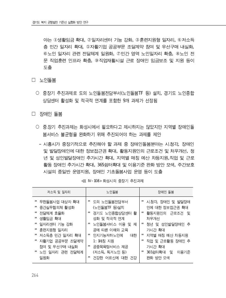 경기도 복지 균형발전 기준선 실효화 방안 연구 264 저소득 및 일자리 노인돌봄 장애인 돌봄  무한돌봄사업 대상자 확대  중간실무협의체 활성화  전달체계 효율화  생활임금 확대  일자리센터 기능 강화  훈련지원형 일자리  저소득층 민간 일자리 확대  자활기업 공공부문 조달계약 참여 및 우선구매 내실화  노인 일자리 관련 전달체계 일원화  도의 노인돌봄전담부서 (노인돌봄TF 등)설치  경기도 노인종합상담센터 활 성화 및 적극적 연계  노인돌봄서비스 이용 및 제 공에 따른 이해와 교육  인지기능저하노인에 대한 1:1매칭 지원  공중목욕탕서비스 제공 (저소득, 독거노인 등)  건강한 어르신에 대한 건강  시․청각, 장애인 및 발달장애 인에 대한 정보접근권 확대  활동지원인의 근로조건 및 처우개선  청년 및 성인발달장애인 추 가시간 확대  지역별 매칭 예산 차등지원  직업 및 근로활동 장애인 추 가시간 확대  365쉼터확대 및 이용기준 완화 방안 모색 <표 Ⅳ-108> 화성시의 중장기 추진과제 야는 ①생활임금 확대, ②일자리센터 기능 강화, ③훈련지원형 일자리, ④저소득 층 민간 일자리 확대, ⑤자활기업 공공부문 조달계약 참여 및 우선구매 내실화, ⑥노인 일자리 관련 전달체계 일원화, ⑦민간 영역 노인일자리 확충, ⑧노인 전 문 직업훈련 인프라 확충, ⑨직업재활시설 근로 장애인 임금보조 및 지원 등이 도출 □ 노인돌봄 ○ 중장기 추진과제로 도의 노인돌봄전담부서(노인돌봄TF 등) 설치, 경기도 노인종합 상담센터 활성화 및 적극적 연계를 포함한 9개 과제가 선정됨 □ 장애인 돌봄 ○ 중․장기 추진과제는 화성시에서 필요하다고 제시하지는 않았지만 지역별 장애인돌 봄서비스 불균형을 완화하기 위해 추진되어야 하는 과제를 제안 - 시흥시가 중장기적으로 추진해야 할 과제 중 장애인돌봄분야는 시․청각, 장애인 및 발달장애인에 대한 정보접근권 확대, 활동지원인의 근로조건 및 처우개선, 청 년 및 성인발달장애인 추가시간 확대, 지역별 매칭 예산 차등지원,직업 및 근로 활동 장애인 추가시간 확대, 365쉼터확대 및 이용기준 완화 방안 모색, 주간보호 시설의 종일반 운영지원, 장애인 기초돌봄사업 운영 등이 도출