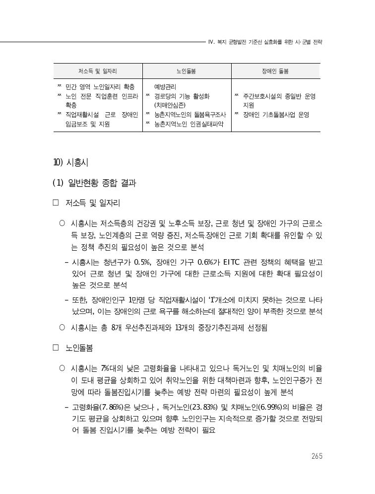 Ⅳ. 복지 균형발전 기준선 실효화를 위한 시·군별 전략 265 저소득 및 일자리 노인돌봄 장애인 돌봄  민간 영역 노인일자리 확충  노인 전문 직업훈련 인프라 확충  직업재활시설 근로 장애인 임금보조 및 지원 예방관리  경로당의 기능 활성화 (치매안심존)  농촌지역노인의 돌봄욕구조사  농촌지역노인 인권실태파악  주간보호시설의 종일반 운영 지원  장애인 기초돌봄사업 운영 10) 시흥시 (1) 일반현황 종합 결과 □ 저소득 및 일자리 ○ 시흥시는 저소득층의 건강권 및 노후소득 보장, 근로 청년 및 장애인 가구의 근로소 득 보장, 노인계층의 근로 역량 증진, 저소득․장애인 근로 기회 확대를 유인할 수 있 는 정책 추진의 필요성이 높은 것으로 분석 - 시흥시는 청년구가 0.5%, 장애인 가구 0.6%가 EITC 관련 정책의 혜택을 받고 있어 근로 청년 및 장애인 가구에 대한 근로소득 지원에 대한 확대 필요성이 높은 것으로 분석 - 또한, 장애인인구 1만명 당 직업재활시설이 ‘1’개소에 미치지 못하는 것으로 나타 났으며, 이는 장애인의 근로 욕구를 해소하는데 절대적인 양이 부족한 것으로 분석 ○ 시흥시는 총 8개 우선추진과제와 13개의 중장기추진과제 선정됨 □ 노인돌봄 ○ 시흥시는 7%대의 낮은 고령화율을 나타내고 있으나 독거노인 및 치매노인의 비율 이 도내 평균을 상회하고 있어 취약노인을 위한 대책마련과 향후, 노인인구증가 전 망에 따라 돌봄진입시기를 늦추는 예방 전략 마련의 필요성이 높게 분석 - 고령화율(7.86%)은 낮으나 , 독거노인(23.83%) 및 치매노인(6.99%)의 비율은 경 기도 평균을 상회하고 있으며 향후 노인인구는 지속적으로 증가할 것으로 전망되 어 돌봄 진입시기를 늦추는 예방 전략이 필요