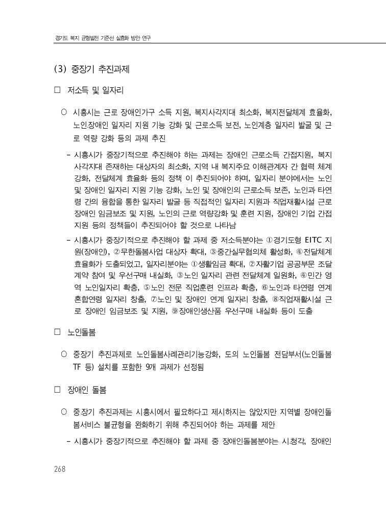 경기도 복지 균형발전 기준선 실효화 방안 연구 268 (3) 중장기 추진과제 □ 저소득 및 일자리 ○ 시흥시는 근로 장애인가구 소득 지원, 복지사각지대 최소화, 복지전달체계 효율화, 노인․장애인 일자리 지원 기능 강화 및 근로소득 보전, 노인계층 일자리 발굴 및 근 로 역량 강화 등의 과제 추진 - 시흥시가 중장기적으로 추진해야 하는 과제는 장애인 근로소득 간접지원, 복지 사각지대 존재하는 대상자의 최소화, 지역 내 복지주요 이해관계자 간 협력 체계 강화, 전달체계 효율화 등의 정책 이 추진되어야 하며, 일자리 분야에서는 노인 및 장애인 일자리 지원 기능 강화, 노인 및 장애인의 근로소득 보존, 노인과 타연 령 간의 융합을 통한 일자리 발굴 등 직접적인 일자리 지원과 직업재활시설 근로 장애인 임금보조 및 지원, 노인의 근로 역량강화 및 훈련 지원, 장애인 기업 간접 지원 등의 정책들이 추진되어야 할 것으로 나타남 - 시흥시가 중장기적으로 추진해야 할 과제 중 저소득분야는 ①경기도형 EITC 지 원(장애인), ②무한돌봄사업 대상자 확대, ③중간실무협의체 활성화, ④전달체계 효율화가 도출되었고, 일자리분야는 ①생활임금 확대, ②자활기업 공공부문 조달 계약 참여 및 우선구매 내실화, ③노인 일자리 관련 전달체계 일원화, ④민간 영 역 노인일자리 확충, ⑤노인 전문 직업훈련 인프라 확충, ⑥노인과 타연령 연계 혼합연령 일자리 창출, ⑦노인 및 장애인 연계 일자리 창출, ⑧직업재활시설 근 로 장애인 임금보조 및 지원, ⑨장애인생산품 우선구매 내실화 등이 도출 □ 노인돌봄 ○ 중장기 추진과제로 노인돌봄사례관리기능강화, 도의 노인돌봄 전담부서(노인돌봄 TF 등) 설치를 포함한 9개 과제가 선정됨 □ 장애인 돌봄 ○ 중․장기 추진과제는 시흥시에서 필요하다고 제시하지는 않았지만 지역별 장애인돌 봄서비스 불균형을 완화하기 위해 추진되어야 하는 과제를 제안 - 시흥시가 중장기적으로 추진해야 할 과제 중 장애인돌봄분야는 시․청각, 장애인