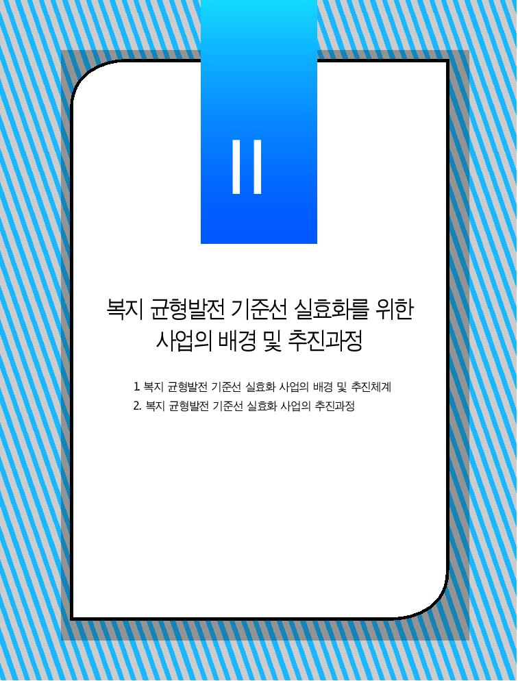Ⅱ복지 균형발전 기준선 실효화를 위한 사업의 배경 및 추진과정 1. 복지 균형발전 기준선 실효화 사업의 배경 및 추진체계 2. 복지 균형발전 기준선 실효화 사업의 추진과정