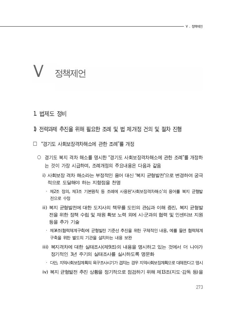 Ⅴ. 정책제언 273 Ⅴ 정책제언 1. 법제도 정비 1) 전략과제 추진을 위해 필요한 조례 및 법 제․개정 건의 및 절차 진행 □ “경기도 사회보장격차해소에 관한 조례”를 개정 ○ 경기도 복지 격차 해소를 명시한 “경기도 사회보장격차해소에 관한 조례”를 개정하 는 것이 가장 시급하며, 조례개정의 주요내용은 다음과 같음 i) 사회보장 격차 해소라는 부정적인 용어 대신 ‘복지 균형발전’으로 변경하여 궁극 적으로 도달해야 하는 지향점을 천명 ・ 제2조 정의, 제3조 기본원칙 등 조례에 사용된‘사회보장격차해소’의 용어를 복지 균형발 전으로 수정 ii) 복지 균형발전에 대한 도지사의 책무를 도민의 관심과 이해 증진, 복지 균형발 전을 위한 정책 수립 및 재원 확보 노력 외에 시·군과의 협력 및 인센티브 지원 등을 추가 기술 ・ 제14조(협력체계구축)에 균형발전 기준선 추진을 위한 구체적인 내용, 예를 들면 협력체계 구축을 위한 별도의 기관을 설치하는 내용 보완 iii) 복지격차에 대한 실태조사(제9조)의 내용을 명시하고 있는 것에서 더 나아가 정기적인 3년 주기의 실태조사를 실시하도록 명문화 ・ 다만, 지역사회보장계획의 욕구조사시기가 겹치는 경우 지역사회보장계획으로 대체한다고 명시 iv) 복지 균형발전 추진 상황을 정기적으로 점검하기 위해 제13조(지도・감독 등)을