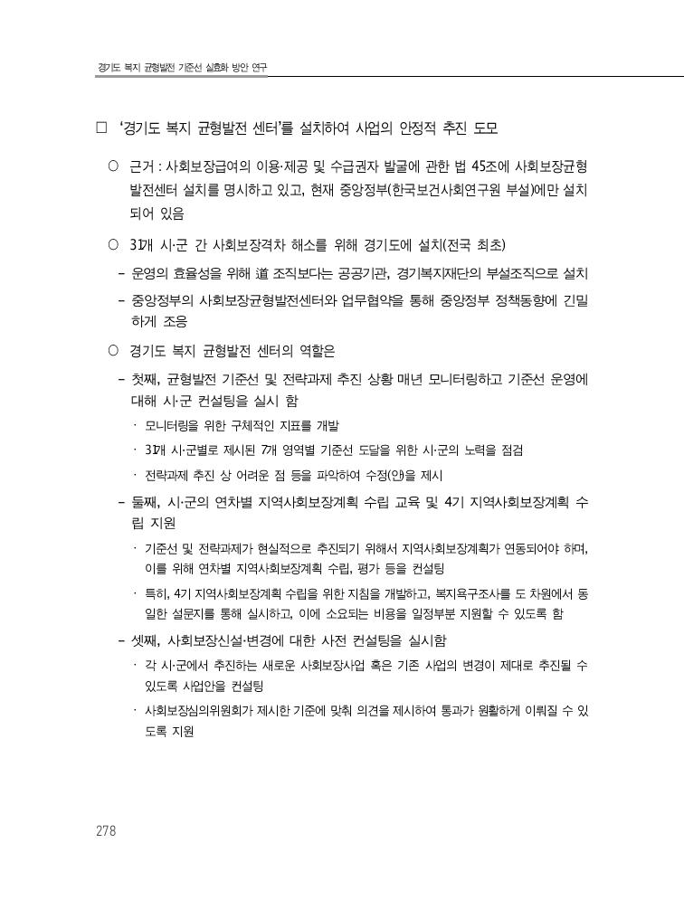 경기도 복지 균형발전 기준선 실효화 방안 연구 278 □ ‘경기도 복지 균형발전 센터’를 설치하여 사업의 안정적 추진 도모 ○ 근거:사회보장급여의 이용·제공 및 수급권자 발굴에 관한 법 45조에 사회보장균형 발전센터 설치를 명시하고 있고, 현재 중앙정부(한국보건사회연구원 부설)에만 설치 되어 있음 ○ 31개 시·군 간 사회보장격차 해소를 위해 경기도에 설치(전국 최초) - 운영의 효율성을 위해 道 조직보다는 공공기관, 경기복지재단의 부설조직으로 설치 - 중앙정부의 사회보장균형발전센터와 업무협약을 통해 중앙정부 정책동향에 긴밀 하게 조응 ○ 경기도 복지 균형발전 센터의 역할은 - 첫째, 균형발전 기준선 및 전략과제 추진 상황 매년 모니터링하고 기준선 운영에 대해 시·군 컨설팅을 실시 함 ・ 모니터링을 위한 구체적인 지표를 개발 ・ 31개 시·군별로 제시된 7개 영역별 기준선 도달을 위한 시·군의 노력을 점검 ・ 전략과제 추진 상 어려운 점 등을 파악하여 수정(안)을 제시 - 둘째, 시·군의 연차별 지역사회보장계획 수립 교육 및 4기 지역사회보장계획 수 립 지원 ・ 기준선 및 전략과제가 현실적으로 추진되기 위해서 지역사회보장계획가 연동되어야 하며, 이를 위해 연차별 지역사회보장계획 수립, 평가 등을 컨설팅 ・ 특히, 4기 지역사회보장계획 수립을 위한 지침을 개발하고, 복지욕구조사를 도 차원에서 동 일한 설문지를 통해 실시하고, 이에 소요되는 비용을 일정부분 지원할 수 있도록 함 - 셋째, 사회보장신설·변경에 대한 사전 컨설팅을 실시함 ・ 각 시·군에서 추진하는 새로운 사회보장사업 혹은 기존 사업의 변경이 제대로 추진될 수 있도록 사업안을 컨설팅 ・ 사회보장심의위원회가 제시한 기준에 맞춰 의견을 제시하여 통과가 원활하게 이뤄질 수 있 도록 지원