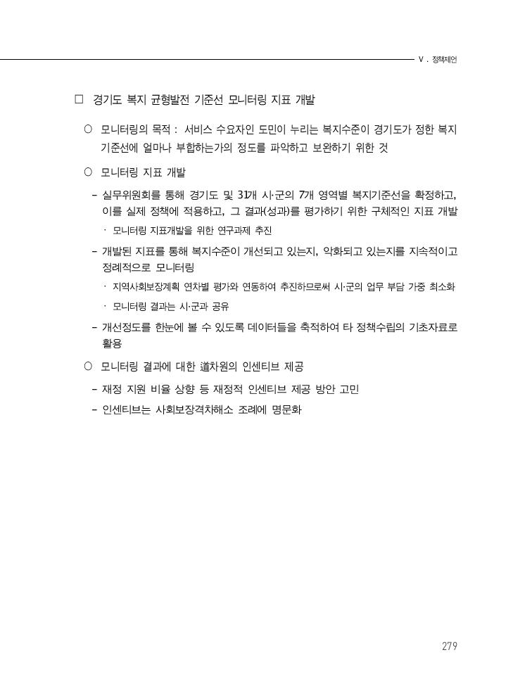 Ⅴ. 정책제언 279 □ 경기도 복지 균형발전 기준선 모니터링 지표 개발 ○ 모니터링의 목적: 서비스 수요자인 도민이 누리는 복지수준이 경기도가 정한 복지 기준선에 얼마나 부합하는가의 정도를 파악하고 보완하기 위한 것 ○ 모니터링 지표 개발 - 실무위원회를 통해 경기도 및 31개 시·군의 7개 영역별 복지기준선을 확정하고, 이를 실제 정책에 적용하고, 그 결과(성과)를 평가하기 위한 구체적인 지표 개발 ・ 모니터링 지표개발을 위한 연구과제 추진 - 개발된 지표를 통해 복지수준이 개선되고 있는지, 악화되고 있는지를 지속적이고 정례적으로 모니터링 ・ 지역사회보장계획 연차별 평가와 연동하여 추진하므로써 시·군의 업무 부담 가중 최소화 ・ 모니터링 결과는 시·군과 공유 - 개선정도를 한눈에 볼 수 있도록 데이터들을 축적하여 타 정책수립의 기초자료로 활용 ○ 모니터링 결과에 대한 道차원의 인센티브 제공 - 재정 지원 비율 상향 등 재정적 인센티브 제공 방안 고민 - 인센티브는 사회보장격차해소 조례에 명문화