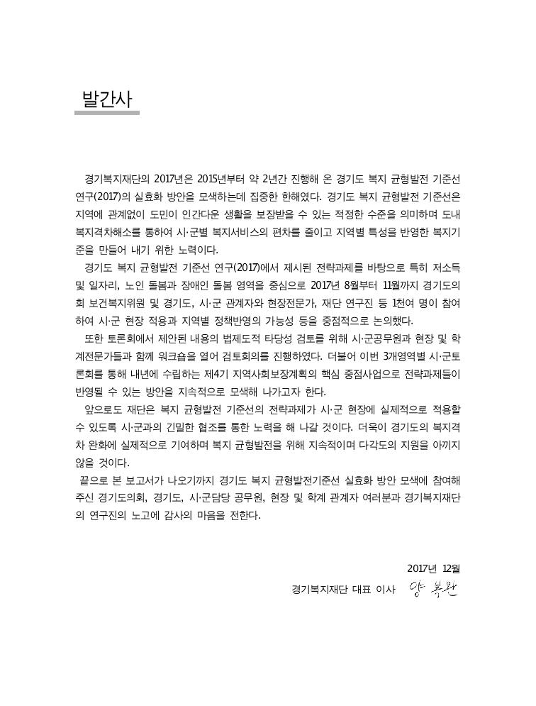 발간사 경기복지재단의 2017년은 2015년부터 약 2년간 진행해 온 경기도 복지 균형발전 기준선 연구(2017)의 실효화 방안을 모색하는데 집중한 한해였다. 경기도 복지 균형발전 기준선은 지역에 관계없이 도민이 인간다운 생활을 보장받을 수 있는 적정한 수준을 의미하며 도내 복지격차해소를 통하여 시·군별 복지서비스의 편차를 줄이고 지역별 특성을 반영한 복지기 준을 만들어 내기 위한 노력이다. 경기도 복지 균형발전 기준선 연구(2017)에서 제시된 전략과제를 바탕으로 특히 저소득 및 일자리, 노인 돌봄과 장애인 돌봄 영역을 중심으로 2017년 8월부터 11월까지 경기도의 회 보건복지위원 및 경기도, 시·군 관계자와 현장전문가, 재단 연구진 등 1천여 명이 참여 하여 시·군 현장 적용과 지역별 정책반영의 가능성 등을 중점적으로 논의했다. 또한 토론회에서 제안된 내용의 법제도적 타당성 검토를 위해 시·군공무원과 현장 및 학 계전문가들과 함께 워크숍을 열어 검토회의를 진행하였다. 더불어 이번 3개영역별 시·군토 론회를 통해 내년에 수립하는 제4기 지역사회보장계획의 핵심 중점사업으로 전략과제들이 반영될 수 있는 방안을 지속적으로 모색해 나가고자 한다. 앞으로도 재단은 복지 균형발전 기준선의 전략과제가 시·군 현장에 실제적으로 적용할 수 있도록 시·군과의 긴밀한 협조를 통한 노력을 해 나갈 것이다. 더욱이 경기도의 복지격 차 완화에 실제적으로 기여하며 복지 균형발전을 위해 지속적이며 다각도의 지원을 아끼지 않을 것이다. 끝으로 본 보고서가 나오기까지 경기도 복지 균형발전기준선 실효화 방안 모색에 참여해 주신 경기도의회, 경기도, 시·군담당 공무원, 현장 및 학계 관계자 여러분과 경기복지재단 의 연구진의 노고에 감사의 마음을 전한다. 2017년 12월 경기복지재단 대표 이사