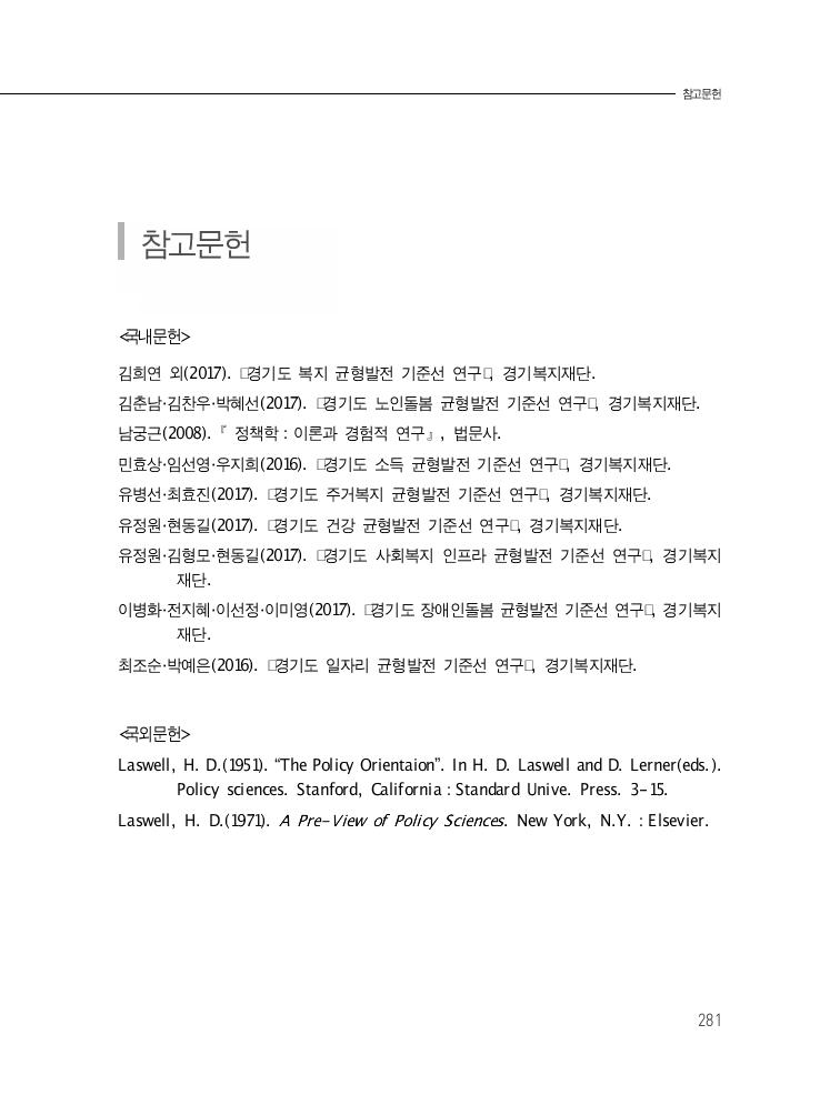 참고문헌 281 참고문헌 <국내문헌> 김희연 외(2017). 경기도 복지 균형발전 기준선 연구, 경기복지재단. 김춘남·김찬우·박혜선(2017). 경기도 노인돌봄 균형발전 기준선 연구, 경기복지재단. 남궁근(2008). 『정책학:이론과 경험적 연구』, 법문사. 민효상·임선영·우지희(2016). 경기도 소득 균형발전 기준선 연구, 경기복지재단. 유병선·최효진(2017). 경기도 주거복지 균형발전 기준선 연구, 경기복지재단. 유정원·현동길(2017). 경기도 건강 균형발전 기준선 연구, 경기복지재단. 유정원·김형모·현동길(2017). 경기도 사회복지 인프라 균형발전 기준선 연구, 경기복지 재단. 이병화·전지혜·이선정·이미영(2017). 경기도 장애인돌봄 균형발전 기준선 연구, 경기복지 재단. 최조순·박예은(2016). 경기도 일자리 균형발전 기준선 연구, 경기복지재단. <국외문헌> Laswell, H. D.(1951). “The Policy Orientaion”. In H. D. Laswell and D. Lerner(eds.). Policy sciences. Stanford, California:Standard Unive. Press. 3-15. Laswell, H. D.(1971). A Pre-View of Policy Sciences. New York, N.Y.:Elsevier.