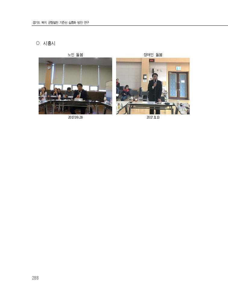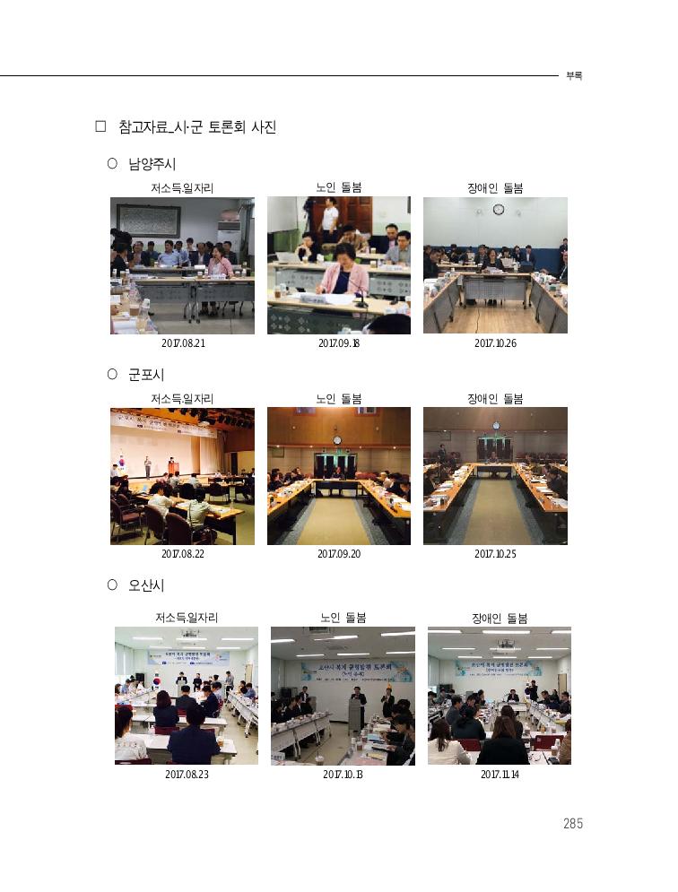 부록 285 □ 참고자료_시·군 토론회 사진 ○ 남양주시 저소득․일자리 노인 돌봄 장애인 돌봄 2017.08.21 2017.09.18 2017.10.26 ○ 군포시 저소득․일자리 노인 돌봄 장애인 돌봄 2017.08.22 2017.09.20 2017.10.25 ○ 오산시 저소득․일자리 노인 돌봄 장애인 돌봄 2017.08.23 2017.10.13 2017.11.14