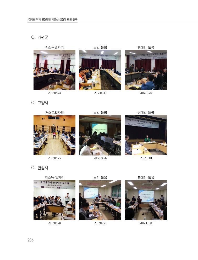 경기도 복지 균형발전 기준선 실효화 방안 연구 286 ○ 가평군 저소득․일자리 노인 돌봄 장애인 돌봄 2017.08.24 2017.09.19 2017.10.26 ○ 고양시 저소득․일자리 노인 돌봄 장애인 돌봄 2017.08.25 2017.09.26 2017.11.01 ○ 안성시 저소득・일자리 노인 돌봄 장애인 돌봄 2017.08.28 2017.09.21 2017.10.30