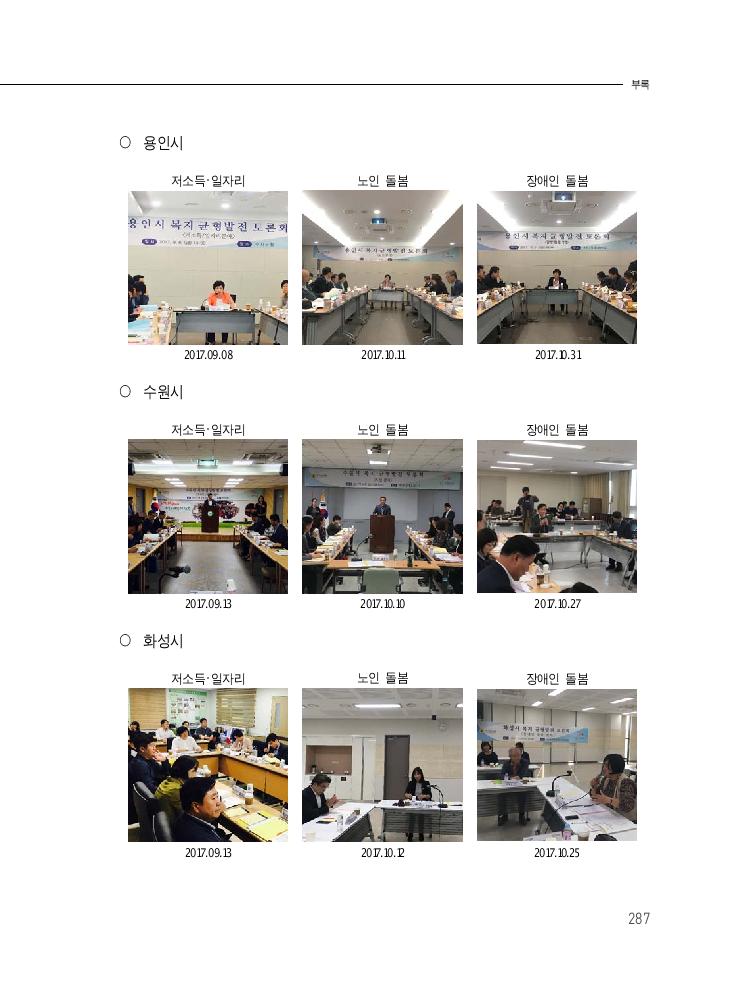 부록 287 ○ 용인시 저소득・일자리 노인 돌봄 장애인 돌봄 2017.09.08 2017.10.11 2017.10.31 ○ 수원시 저소득・일자리 노인 돌봄 장애인 돌봄 2017.09.13 2017.10.10 2017.10.27 ○ 화성시 저소득・일자리 노인 돌봄 장애인 돌봄 2017.09.13 2017.10.12 2017.10.25