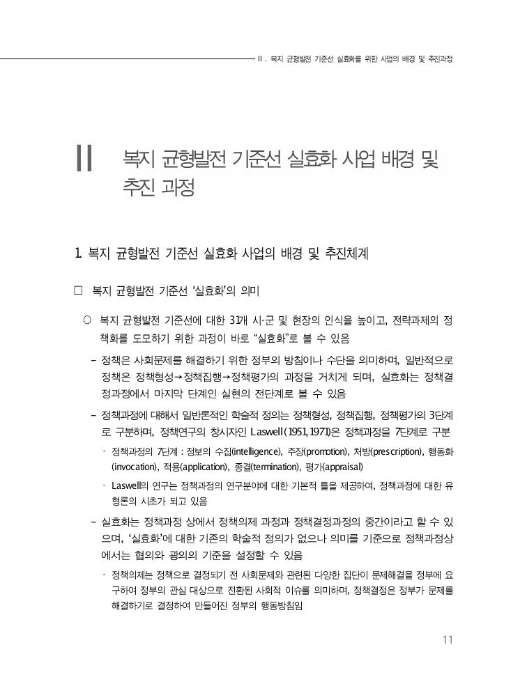 Ⅱ. 복지 균형발전 기준선 실효화를 위한 사업의 배경 및 추진과정 11 Ⅱ 복지 균형발전 기준선 실효화 사업 배경 및 추진 과정 1. 복지 균형발전 기준선 실효화 사업의 배경 및 추진체계 □ 복지 균형발전 기준선 ‘실효화’의 의미 ○ 복지 균형발전 기준선에 대한 31개 시·군 및 현장의 인식을 높이고, 전략과제의 정 책화를 도모하기 위한 과정이 바로 “실효화”로 볼 수 있음 - 정책은 사회문제를 해결하기 위한 정부의 방침이나 수단을 의미하며, 일반적으로 정책은 정책형성→정책집행→정책평가의 과정을 거치게 되며, 실효화는 정책결 정과정에서 마지막 단계인 실현의 전단계로 볼 수 있음 - 정책과정에 대해서 일반론적인 학술적 정의는 정책형성, 정책집행, 정책평가의 3단계 로 구분하며, 정책연구의 창시자인 Laswell(1951,1971)은 정책과정을 7단계로 구분 ・ 정책과정의 7단계:정보의 수집(intelligence), 주장(promotion), 처방(prescription), 행동화 (invocation), 적용(application), 종결(termination), 평가(appraisal) ・ Laswell의 연구는 정책과정의 연구분야에 대한 기본적 틀을 제공하여, 정책과정에 대한 유 형론의 시초가 되고 있음 - 실효화는 정책과정 상에서 정책의제 과정과 정책결정과정의 중간이라고 할 수 있 으며, ‘실효화’에 대한 기존의 학술적 정의가 없으나 의미를 기준으로 정책과정상 에서는 협의와 광의의 기준을 설정할 수 있음 ・ 정책의제는 정책으로 결정되기 전 사회문제와 관련된 다양한 집단이 문제해결을 정부에 요 구하여 정부의 관심 대상으로 전환된 사회적 이슈를 의미하며, 정책결정은 정부가 문제를 해결하기로 결정하여 만들어진 정부의 행동방침임