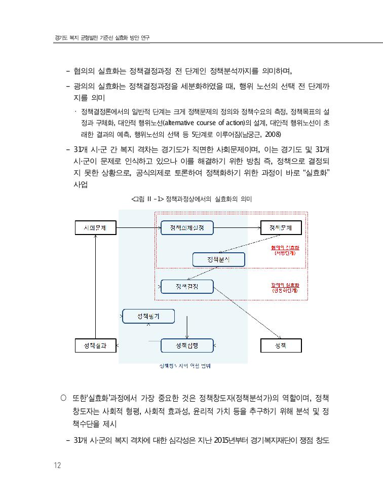 경기도 복지 균형발전 기준선 실효화 방안 연구 12 - 협의의 실효화는 정책결정과정 전 단계인 정책분석까지를 의미하며, - 광의의 실효화는 정책결정과정을 세분화하였을 때, 행위 노선의 선택 전 단계까 지를 의미 ・ 정책결정론에서의 일반적 단계는 크게 정책문제의 정의와 정책수요의 측정, 정책목표의 설 정과 구체화, 대안적 행위노선(alternative course of action)의 설계, 대안적 행위노선이 초 래한 결과의 예측, 행위노선의 선택 등 5단계로 이루어짐(남궁근, 2008) - 31개 시·군 간 복지 격차는 경기도가 직면한 사회문제이며, 이는 경기도 및 31개 시·군이 문제로 인식하고 있으나 이를 해결하기 위한 방침 즉, 정책으로 결정되 지 못한 상황으로, 공식의제로 토론하여 정책화하기 위한 과정이 바로 “실효화” 사업 <그림 Ⅱ-1> 정책과정상에서의 실효화의 의미 ○ 또한‘실효화’과정에서 가장 중요한 것은 정책창도자(정책분석가)의 역할이며, 정책 창도자는 사회적 형평, 사회적 효과성, 윤리적 가치 등을 추구하기 위해 분석 및 정 책수단을 제시 - 31개 시·군의 복지 격차에 대한 심각성은 지난 2015년부터 경기복지재단이 쟁점 창도
