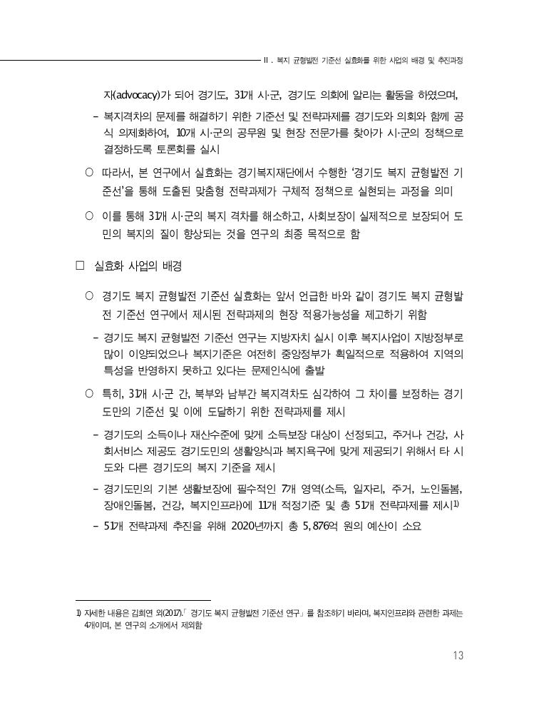 Ⅱ. 복지 균형발전 기준선 실효화를 위한 사업의 배경 및 추진과정 13 자(advocacy)가 되어 경기도, 31개 시·군, 경기도 의회에 알리는 활동을 하였으며, - 복지격차의 문제를 해결하기 위한 기준선 및 전략과제를 경기도와 의회와 함께 공 식 의제화하여, 10개 시·군의 공무원 및 현장 전문가를 찾아가 시·군의 정책으로 결정하도록 토론회를 실시 ○ 따라서, 본 연구에서 실효화는 경기복지재단에서 수행한 ‘경기도 복지 균형발전 기 준선’을 통해 도출된 맞춤형 전략과제가 구체적 정책으로 실현되는 과정을 의미 ○ 이를 통해 31개 시·군의 복지 격차를 해소하고, 사회보장이 실제적으로 보장되어 도 민의 복지의 질이 향상되는 것을 연구의 최종 목적으로 함 □ 실효화 사업의 배경 ○ 경기도 복지 균형발전 기준선 실효화는 앞서 언급한 바와 같이 경기도 복지 균형발 전 기준선 연구에서 제시된 전략과제의 현장 적용가능성을 제고하기 위함 - 경기도 복지 균형발전 기준선 연구는 지방자치 실시 이후 복지사업이 지방정부로 많이 이양되었으나 복지기준은 여전히 중앙정부가 획일적으로 적용하여 지역의 특성을 반영하지 못하고 있다는 문제인식에 출발 ○ 특히, 31개 시·군 간, 북부와 남부간 복지격차도 심각하여 그 차이를 보정하는 경기 도만의 기준선 및 이에 도달하기 위한 전략과제를 제시 - 경기도의 소득이나 재산수준에 맞게 소득보장 대상이 선정되고, 주거나 건강, 사 회서비스 제공도 경기도민의 생활양식과 복지욕구에 맞게 제공되기 위해서 타 시 도와 다른 경기도의 복지 기준을 제시 - 경기도민의 기본 생활보장에 필수적인 7개 영역(소득, 일자리, 주거, 노인돌봄, 장애인돌봄, 건강, 복지인프라)에 11개 적정기준 및 총 51개 전략과제를 제시1) - 51개 전략과제 추진을 위해 2020년까지 총 5,876억 원의 예산이 소요 1) 자세한 내용은 김희연 외(2017).「경기도 복지 균형발전 기준선 연구」를 참조하기 바라며, 복지인프라와 관련한 과제는 4개이며, 본 연구의 소개에서 제외함