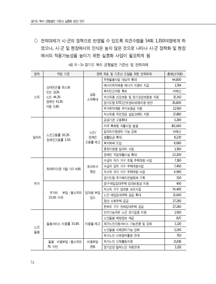 경기도 복지 균형발전 기준선 실효화 방안 연구 14 영역 적정 기준 정책 목표 및 기준선 도달을 위한 전략과제 총예산(억원) 소득 ․ 상대빈곤율 최소화 도민 11.2% 노인 44.2% 장애인 41.5% 아동 5.8% 실질 소득확대 무한돌봄사업 대상자 확대 44,800 에너지취약계층 에너지 지원비 지급 1,764 복지민간자원 확보 비예산 저소득층 건강보험 및 장기요양보험료 지원 13,342 경기도형 EITC(근로장려세제)지원 방안 26,800 주거취약계증 주거보증금 지원 21,560 저소득층 국민연금 실업크레딧 지원 17,880 일자리 ․ 노인고용률 30.2%․ 장애인고용률 3.5% 노인/ 장애인 고용률 제고 공공기관 고용확대 3,280 지역 특화형 자활사업 발굴 163,640 일자리지원센터 기능 강화 비예산 생활임금 확대 8,220 복지화폐 도입 8,680 훈련지원형 일자리 사업 1,360 장애인 직업재활시설 확대 22,200 주거 ․ 최저주거기준 미달 가구 4.6% 최저주거향상 수급자 자가 가구 토탈 주택개량 사업 7,160 수급자 임차 가구 주택개량사업 7,400 저소득 자가 가구 주택개량 사업 4,940 경기도형 주거복지전달체계 구축 330 ․ 주거비 부담:월소득의 25.0% 이하 임대료 부담 감소 영구·매입임대주택 임대보증금 지원 400 저소득 가구 임대료 보조사업 74,400 노인 매입임대주택 공급 확대 13,640 청년 사회주택 공급 27,280 한부모 가구 전세임대주택 공급 27,280 노인 돌봄 ․ 돌봄서비스 이용률 35.8% 이용율 제고 인지기능저하 노인 초기집중 지원 1,560 노인돌봄 예방정보 제공 825 재가노인지원서비스 기능전환 및 강화 3,120 노인돌봄 사례관리기능 강화 3,240 독거노인 사회참여활동 연계 750 ․ 돌봄 비용부담:월소득의 7% 미만 비용부담 완화 독거노인 신체활동지원 21,816 장기요양 탈락노인 자원연계 3,120 <표 Ⅱ-1> 경기도 복지 균형발전 기준선 및 전략과제 ○ 전략과제가 시·군의 정책으로 반영될 수 있도록 의견수렴을 54회 1,350여명에게 하 였으나, 시·군 및 현장에서의 인식은 높지 않은 것으로 나타나 시·군 정책화 및 현장 에서의 적용가능성을 높이기 위한 실효화 사업이 필요하게 됨
