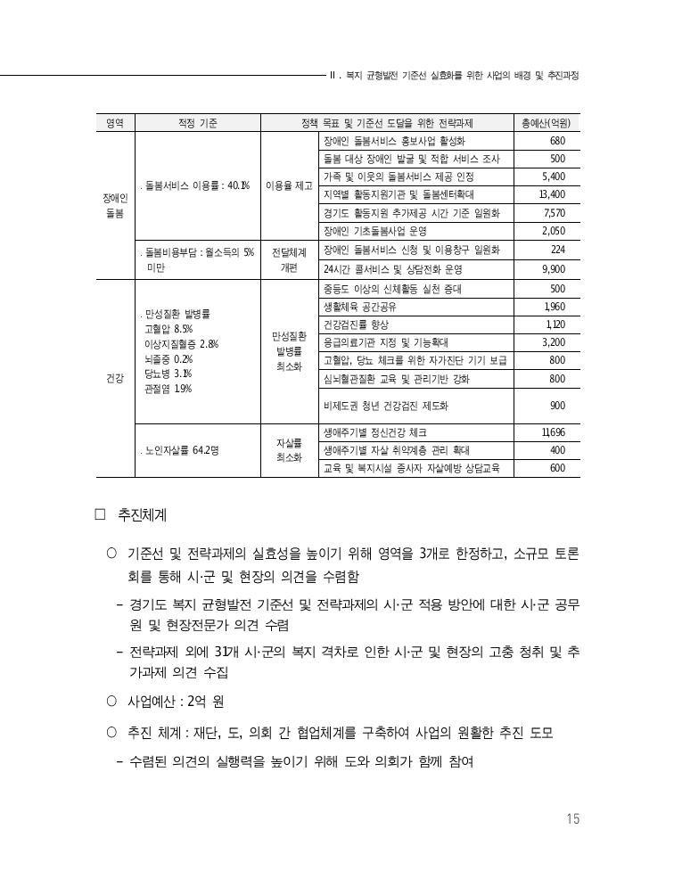 Ⅱ. 복지 균형발전 기준선 실효화를 위한 사업의 배경 및 추진과정 15 영역 적정 기준 정책 목표 및 기준선 도달을 위한 전략과제 총예산(억원) 장애인 돌봄 ․ 돌봄서비스 이용률:40.1% 이용율 제고 장애인 돌봄서비스 홍보사업 활성화 680 돌봄 대상 장애인 발굴 및 적합 서비스 조사 500 가족 및 이웃의 돌봄서비스 제공 인정 5,400 지역별 활동지원기관 및 돌봄센터확대 13,400 경기도 활동지원 추가제공 시간 기준 일원화 7,570 장애인 기초돌봄사업 운영 2,050 ․ 돌봄비용부담:월소득의 5% 미만 전달체계 개편 장애인 돌봄서비스 신청 및 이용창구 일원화 224 24시간 콜서비스 및 상담전화 운영 9,900 건강 ․ 만성질환 발병률 고혈압 8.5% 이상지질혈증 2.8% 뇌졸중 0.2% 당뇨병 3.1% 관절염 1.9% 만성질환 발병률 최소화 중등도 이상의 신체활동 실천 증대 500 생활체육 공간공유 1,960 건강검진률 향상 1,120 응급의료기관 지정 및 기능확대 3,200 고혈압, 당뇨 체크를 위한 자가진단 기기 보급 800 심뇌혈관질환 교육 및 관리기반 강화 800 비제도권 청년 건강검진 제도화 900 ․ 노인자살률 64.2명 자살률 최소화 생애주기별 정신건강 체크 11,696 생애주기별 자살 취약계층 관리 확대 400 교육 및 복지시설 종사자 자살예방 상담교육 600 □ 추진체계 ○ 기준선 및 전략과제의 실효성을 높이기 위해 영역을 3개로 한정하고, 소규모 토론 회를 통해 시·군 및 현장의 의견을 수렴함 - 경기도 복지 균형발전 기준선 및 전략과제의 시·군 적용 방안에 대한 시·군 공무 원 및 현장전문가 의견 수렴 - 전략과제 외에 31개 시·군의 복지 격차로 인한 시·군 및 현장의 고충 청취 및 추 가과제 의견 수집 ○ 사업예산:2억 원 ○ 추진 체계:재단, 도, 의회 간 협업체계를 구축하여 사업의 원활한 추진 도모 - 수렴된 의견의 실행력을 높이기 위해 도와 의회가 함께 참여