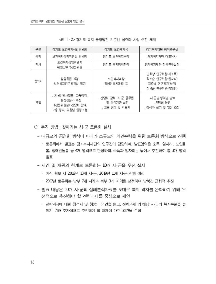 경기도 복지 균형발전 기준선 실효화 방안 연구 16 구분 경기도 보건복지상임위원회 경기도 보건복지국 경기복지재단 정책연구실 책임 보건복지상임위원회 위원장 경기도 보건복지국장 경기복지재단 대표이사 간사 보건복지상임위원회 위원장수석전문위원 경기도 복지정책과장 경기복지재단 정책연구실장 참석자 상임위원 10명보건복지전문위원실 직원 노인복지과장 장애인복지과장 등 민효상 연구위원(저소득) 최조순 연구위원(일자리) 김춘남 연구위원(노인) 이병화 연구위원(장애인) 역할 ․ (의원) 인사말씀, 고충청취, 현장전문가 추천 ․ (전문위원실) 간담회 참여, 고충 정리, 의원님 일정조정 ․ 간담회 참석, 시·군 공무원 및 참석기관 섭외 ․ 고충 정리 및 피드백 시·군별·영역별 발표 ․ 간담회 운영 ․ 참석자 섭외 및 일정 조정 <표 Ⅱ-2> 경기도 복지 균형발전 기준선 실효화 사업 추진 체계 ○ 추진 방법:찾아가는 시·군 토론회 실시 - 대규모의 공청회 방식이 아니라 소규모의 의견수렴을 위한 토론회 방식으로 진행 ・ 토론회에서 발표는 경기복지재단의 연구진이 담당하며, 발표영역은 소득, 일자리, 노인돌 봄, 장애인돌봄 등 4개 영역으로 한정하되, 소득과 일자리는 묶어서 추진하여 총 3개 영역 발표 - 시간 및 재원의 한계로 토론회는 10개 시·군을 우선 실시 ・ 예산 확보 시 2018년 10개 시·군, 2019년 11개 시·군 진행 예정 ・ 2017년 토론회는 남부 7개 지역과 북부 3개 지역을 선정하여 남북간 균형적 추진 - 발표 내용은 10개 시·군의 실태분석자료를 토대로 복지 격차를 완화하기 위해 우 선적으로 추진해야 할 전략과제를 중심으로 제안 ・ 전략과제에 대한 참석자 및 청중의 의견을 듣고, 전략과제 외 해당 시·군의 복지수준을 높 이기 위해 추가적으로 추진해야 할 과제에 대한 의견을 수렴