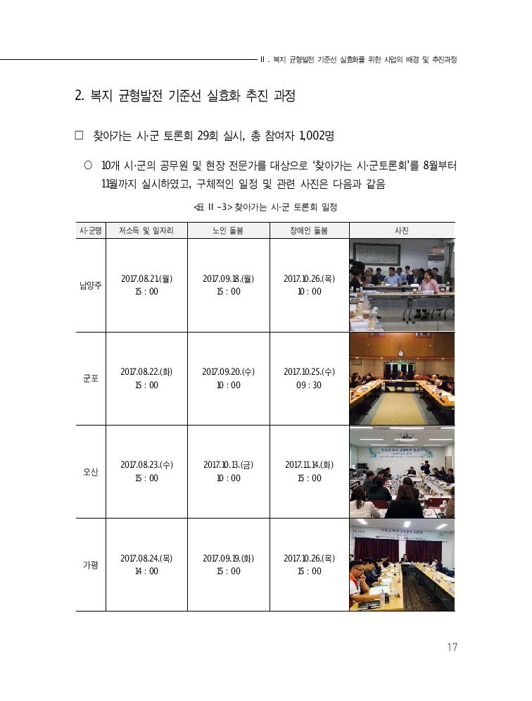 Ⅱ. 복지 균형발전 기준선 실효화를 위한 사업의 배경 및 추진과정 17 시·군명 저소득 및 일자리 노인 돌봄 장애인 돌봄 사진 남양주 2017.08.21.(월) 15:00 2017.09.18.(월) 15:00 2017.10.26.(목) 10:00 군포 2017.08.22.(화) 15:00 2017.09.20.(수) 10:00 2017.10.25.(수) 09:30 오산 2017.08.23.(수) 15:00 2017.10.13.(금) 10:00 2017.11.14.(화) 15:00 가평 2017.08.24.(목) 14:00 2017.09.19.(화) 15:00 2017.10.26.(목) 15:00 <표 Ⅱ-3> 찾아가는 시·군 토론회 일정 2. 복지 균형발전 기준선 실효화 추진 과정 □ 찾아가는 시·군 토론회 29회 실시, 총 참여자 1,002명 ○ 10개 시·군의 공무원 및 현장 전문가를 대상으로 ‘찾아가는 시·군토론회’를 8월부터 11월까지 실시하였고, 구체적인 일정 및 관련 사진은 다음과 같음