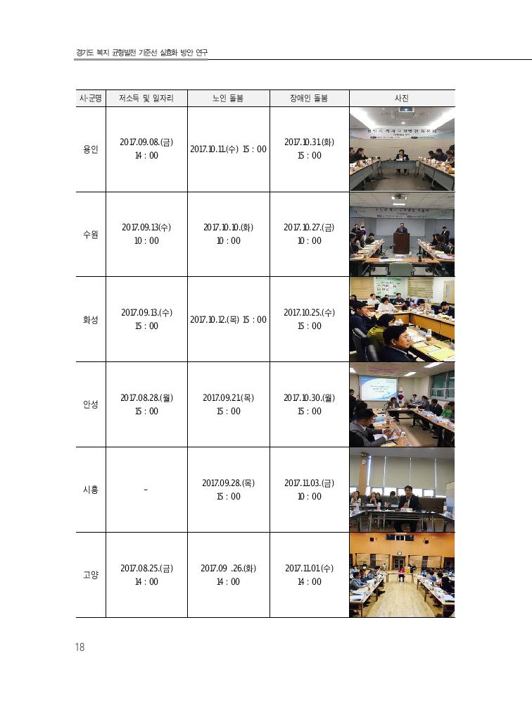 경기도 복지 균형발전 기준선 실효화 방안 연구 18 시·군명 저소득 및 일자리 노인 돌봄 장애인 돌봄 사진 용인 2017.09.08.(금) 14:00 2017.10.11.(수) 15:00 2017.10.31.(화) 15:00 수원 2017.09.13(수) 10:00 2017.10.10.(화) 10:00 2017.10.27.(금) 10:00 화성 2017.09.13.(수) 15:00 2017.10.12.(목) 15:00 2017.10.25.(수) 15:00 안성 2017.08.28.(월) 15:00 2017.09.21.(목) 15:00 2017.10.30.(월) 15:00 시흥 - 2017.09.28.(목) 15:00 2017.11.03.(금) 10:00 고양 2017.08.25.(금) 14:00 2017.09 .26.(화) 14:00 2017.11.01.(수) 14:00