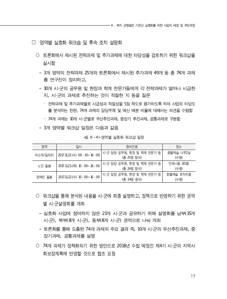 Ⅱ. 복지 균형발전 기준선 실효화를 위한 사업의 배경 및 추진과정 19 □ 영역별 실효화 워크숍 및 후속 조치 설명회 ○ 토론회에서 제시된 전략과제 및 추가과제에 대한 타당성을 검토하기 위한 워크샵을 실시함 - 3개 영역의 전략과제 25개와 토론회에서 제시된 추가과제 49개 등 총 74개 과제 를 연구진이 정리하고, - 10개 시·군의 공무원 및 현장과 학계 전문가들에게 각 전략과제가 얼마나 시급한 지, 시·군의 과제로 추진하는 것이 적절한 지 등을 질문 ・ 전략과제 및 추가과제별로 시급성과 적절성을 5점 척도로 평가하도록 하여 사업의 타당도 를 분석하는 한편, 74개 과제의 담당주체 및 예산 배분 비율에 대해서는 의견을 수렴함 ・ 74개 과제는 10개 시·군별로 우선추진과제, 중장기 추진과제, 공통과제로 구분함 - 3개 영역별 워크샵 일정은 다음과 같음 영역 일시 참석인원 장소 저소득/일자리 2017.11.22.(수) 09:30~16:00 시·군 담당 공무원, 현장 및 학계 전문가 등 (총 25명 참석) 호텔캐슬 나무2실 (수원) 노인 돌봄 2017.11.23.(목) 10:00~16:00 시·군 담당 공무원, 현장 및 학계 전문가 등 (총 24명 참석) 인재니움 201호 (수원) 장애인 돌봄 2017.11.22.(수) 10:00~16:00 시·군 담당 공무원, 현장 및 학계 전문가 등 (총 34명 참석) 호텔캐슬 로자리움 (수원) <표 Ⅱ-4> 영역별 실효화 워크샵 일정 ○ 워크샵을 통해 분석된 내용을 시·군에 최종 설명하고, 정책으로 반영하기 위한 권역 별 시·군설명회를 개최 - 실효화 사업에 참여하지 않은 21개 시·군과 공유하기 위해 설명회를 남부(15개 시·군), 북부(8개 시·군), 동부(8개 시·군) 권역으로 나눠 개최 - 토론회를 통해 도출된 74개 과제의 주요 결과 즉, 10개 시·군의 우선추진과제, 중 장기과제, 공통과제를 설명 ○ 74개 과제가 정책화되기 위한 방안으로 2018년 수립 예정인 제4기 시·군의 지역사 회보장계획에 반영할 것으로 협조 요청