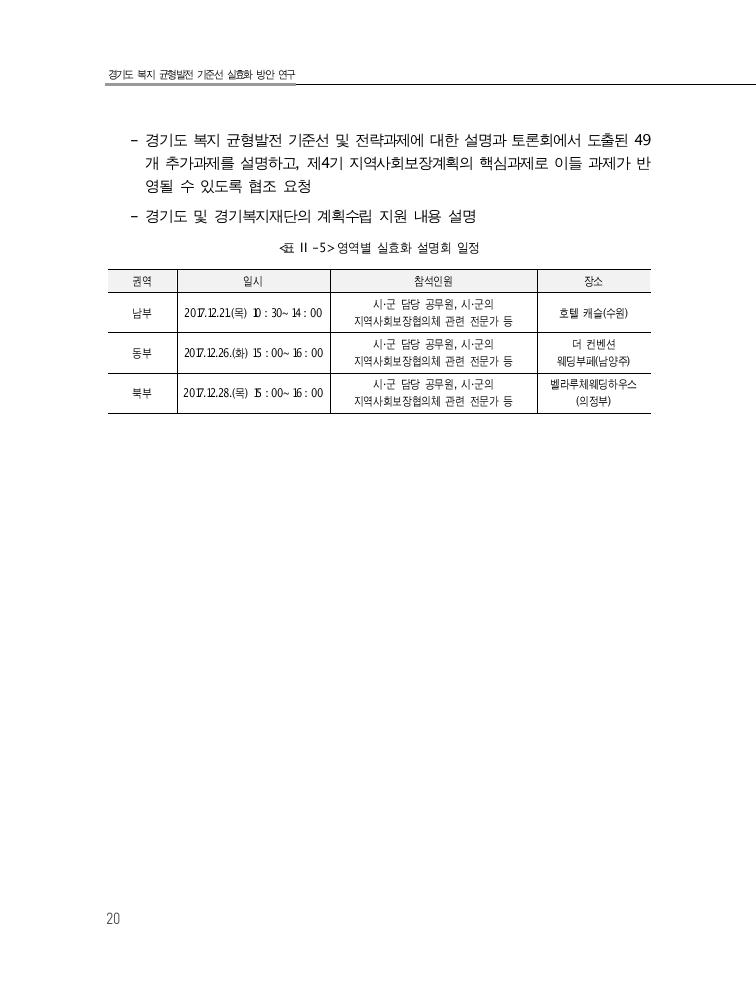 경기도 복지 균형발전 기준선 실효화 방안 연구 20 - 경기도 복지 균형발전 기준선 및 전략과제에 대한 설명과 토론회에서 도출된 49 개 추가과제를 설명하고, 제4기 지역사회보장계획의 핵심과제로 이들 과제가 반 영될 수 있도록 협조 요청 - 경기도 및 경기복지재단의 계획수립 지원 내용 설명 권역 일시 참석인원 장소 남부 2017.12.21.(목) 10:30~14:00 시·군 담당 공무원, 시·군의 지역사회보장협의체 관련 전문가 등 호텔 캐슬(수원) 동부 2017.12.26.(화) 15:00~16:00 시·군 담당 공무원, 시·군의 지역사회보장협의체 관련 전문가 등 더 컨벤션 웨딩부페(남양주) 북부 2017.12.28.(목) 15:00~16:00 시·군 담당 공무원, 시·군의 지역사회보장협의체 관련 전문가 등 벨라루체웨딩하우스 (의정부) <표 Ⅱ-5> 영역별 실효화 설명회 일정