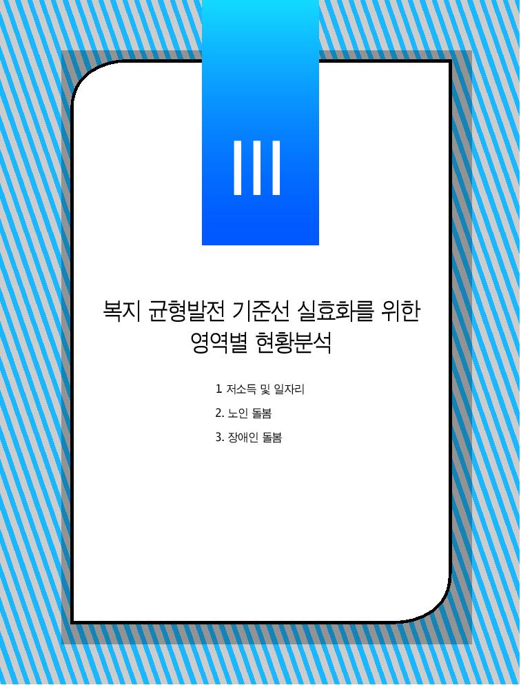 Ⅲ복지 균형발전 기준선 실효화를 위한 영역별 현황분석 1. 저소득 및 일자리 2. 노인 돌봄 3. 장애인 돌봄