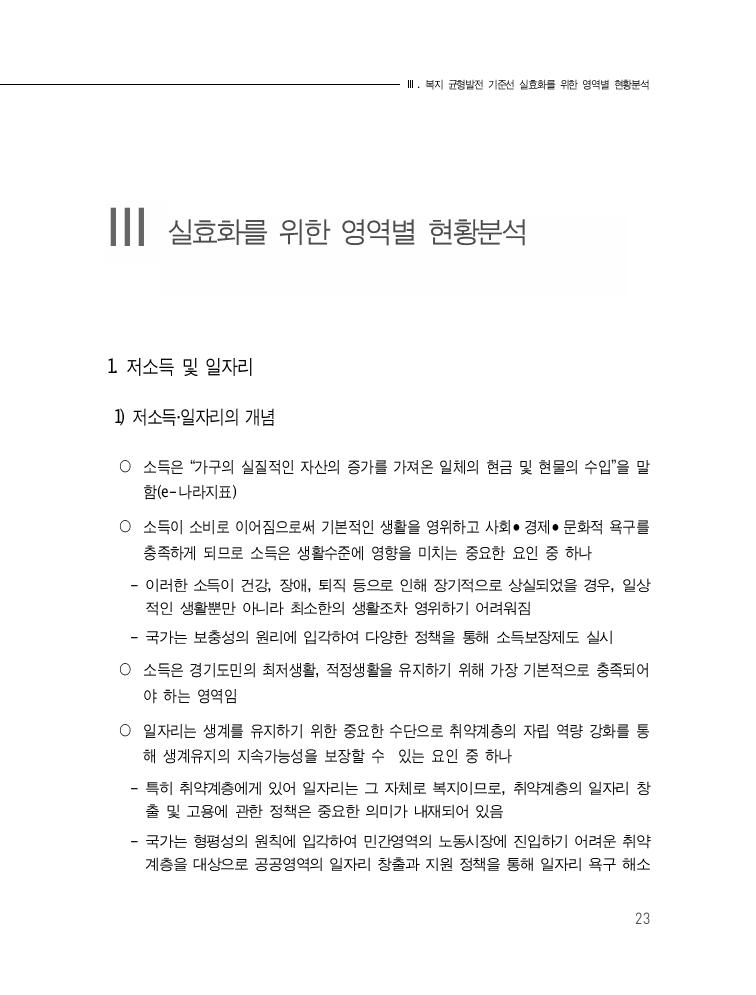 Ⅲ. 복지 균형발전 기준선 실효화를 위한 영역별 현황분석 23 Ⅲ 실효화를 위한 영역별 현황분석 1. 저소득 및 일자리 1) 저소득·일자리의 개념 ○ 소득은 “가구의 실질적인 자산의 증가를 가져온 일체의 현금 및 현물의 수입”을 말 함(e-나라지표) ○ 소득이 소비로 이어짐으로써 기본적인 생활을 영위하고 사회∙ 경제∙ 문화적 욕구를 충족하게 되므로 소득은 생활수준에 영향을 미치는 중요한 요인 중 하나 - 이러한 소득이 건강, 장애, 퇴직 등으로 인해 장기적으로 상실되었을 경우, 일상 적인 생활뿐만 아니라 최소한의 생활조차 영위하기 어려워짐 - 국가는 보충성의 원리에 입각하여 다양한 정책을 통해 소득보장제도 실시 ○ 소득은 경기도민의 최저생활, 적정생활을 유지하기 위해 가장 기본적으로 충족되어 야 하는 영역임 ○ 일자리는 생계를 유지하기 위한 중요한 수단으로 취약계층의 자립 역량 강화를 통 해 생계유지의 지속가능성을 보장할 수 있는 요인 중 하나 - 특히 취약계층에게 있어 일자리는 그 자체로 복지이므로, 취약계층의 일자리 창 출 및 고용에 관한 정책은 중요한 의미가 내재되어 있음 - 국가는 형평성의 원칙에 입각하여 민간영역의 노동시장에 진입하기 어려운 취약 계층을 대상으로 공공영역의 일자리 창출과 지원 정책을 통해 일자리 욕구 해소