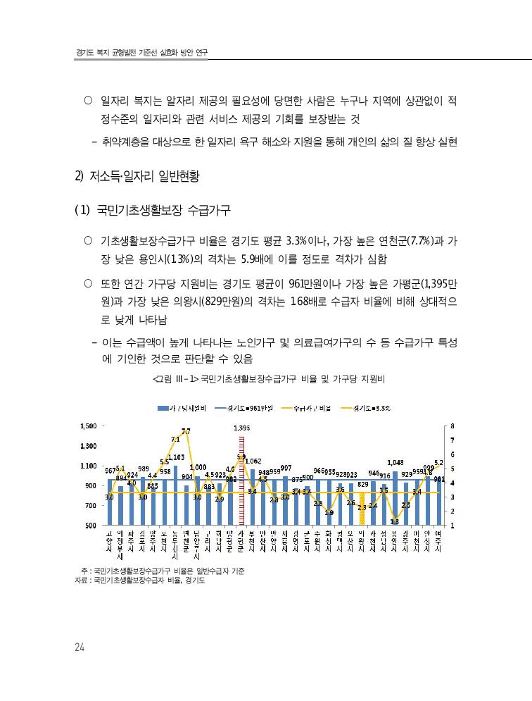경기도 복지 균형발전 기준선 실효화 방안 연구 24 ○ 일자리 복지는 알자리 제공의 필요성에 당면한 사람은 누구나 지역에 상관없이 적 정수준의 일자리와 관련 서비스 제공의 기회를 보장받는 것 - 취약계층을 대상으로 한 일자리 욕구 해소와 지원을 통해 개인의 삶의 질 향상 실현 2) 저소득·일자리 일반현황 (1) 국민기초생활보장 수급가구 ○ 기초생활보장수급가구 비율은 경기도 평균 3.3%이나, 가장 높은 연천군(7.7%)과 가 장 낮은 용인시(1.3%)의 격차는 5.9배에 이를 정도로 격차가 심함 ○ 또한 연간 가구당 지원비는 경기도 평균이 961만원이나 가장 높은 가평군(1,395만 원)과 가장 낮은 의왕시(829만원)의 격차는 1.68배로 수급자 비율에 비해 상대적으 로 낮게 나타남 - 이는 수급액이 높게 나타나는 노인가구 및 의료급여가구의 수 등 수급가구 특성 에 기인한 것으로 판단할 수 있음 <그림 Ⅲ-1> 국민기초생활보장수급가구 비율 및 가구당 지원비 주:국민기초생활보장수급가구 비율은 일반수급자 기준 자료:국민기초생활보장수급자 비율, 경기도