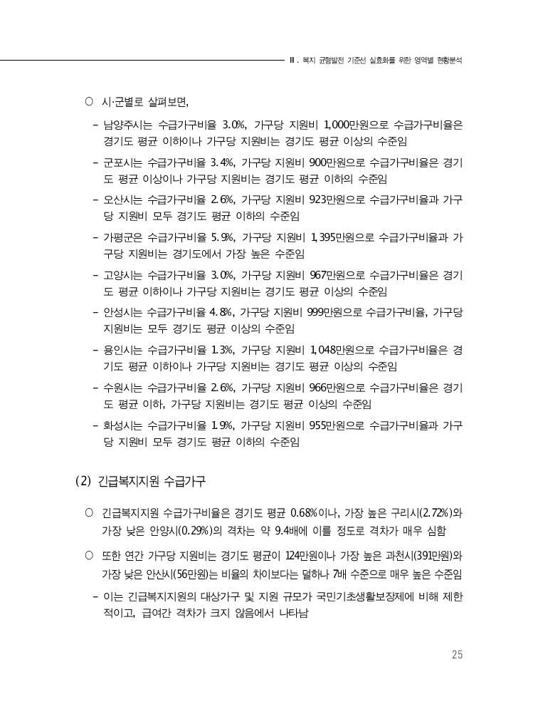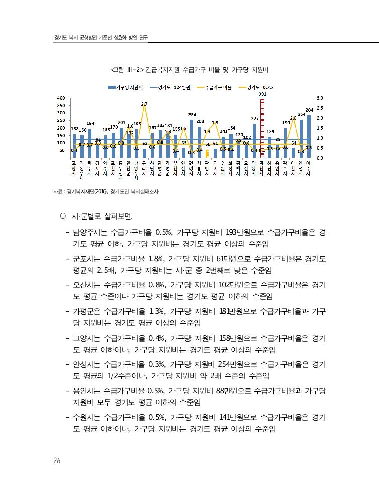 Ⅲ. 복지 균형발전 기준선 실효화를 위한 영역별 현황분석 25 ○ 시·군별로 살펴보면, - 남양주시는 수급가구비율 3.0%, 가구당 지원비 1,000만원으로 수급가구비율은 경기도 평균 이하이나 가구당 지원비는 경기도 평균 이상의 수준임 - 군포시는 수급가구비율 3.4%, 가구당 지원비 900만원으로 수급가구비율은 경기 도 평균 이상이나 가구당 지원비는 경기도 평균 이하의 수준임 - 오산시는 수급가구비율 2.6%, 가구당 지원비 923만원으로 수급가구비율과 가구 당 지원비 모두 경기도 평균 이하의 수준임 - 가평군은 수급가구비율 5.9%, 가구당 지원비 1,395만원으로 수급가구비율과 가 구당 지원비는 경기도에서 가장 높은 수준임 - 고양시는 수급가구비율 3.0%, 가구당 지원비 967만원으로 수급가구비율은 경기 도 평균 이하이나 가구당 지원비는 경기도 평균 이상의 수준임 - 안성시는 수급가구비율 4.8%, 가구당 지원비 999만원으로 수급가구비율, 가구당 지원비는 모두 경기도 평균 이상의 수준임 - 용인시는 수급가구비율 1.3%, 가구당 지원비 1,048만원으로 수급가구비율은 경 기도 평균 이하이나 가구당 지원비는 경기도 평균 이상의 수준임 - 수원시는 수급가구비율 2.6%, 가구당 지원비 966만원으로 수급가구비율은 경기 도 평균 이하, 가구당 지원비는 경기도 평균 이상의 수준임 - 화성시는 수급가구비율 1.9%, 가구당 지원비 955만원으로 수급가구비율과 가구 당 지원비 모두 경기도 평균 이하의 수준임 (2) 긴급복지지원 수급가구 ○ 긴급복지지원 수급가구비율은 경기도 평균 0.68%이나, 가장 높은 구리시(2.72%)와 가장 낮은 안양시(0.29%)의 격차는 약 9.4배에 이를 정도로 격차가 매우 심함 ○ 또한 연간 가구당 지원비는 경기도 평균이 124만원이나 가장 높은 과천시(391만원)와 가장 낮은 안산시(56만원)는 비율의 차이보다는 덜하나 7배 수준으로 매우 높은 수준임 - 이는 긴급복지지원의 대상가구 및 지원 규모가 국민기초생활보장제에 비해 제한 적이고, 급여간 격차가 크지 않음에서 나타남
