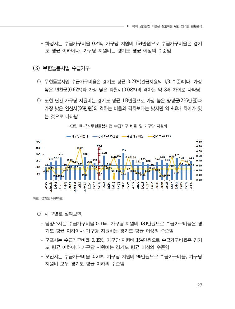 Ⅲ. 복지 균형발전 기준선 실효화를 위한 영역별 현황분석 27 - 화성시는 수급가구비율 0.4%, 가구당 지원비 164만원으로 수급가구비율은 경기 도 평균 이하이나, 가구당 지원비는 경기도 평균 이상의 수준임 (3) 무한돌봄사업 수급가구 ○ 무한돌봄사업 수급가구비율은 경기도 평균 0.23%(긴급지원의 1/3 수준)이나, 가장 높은 연천군(0.67%)과 가장 낮은 과천시(0.08%)의 격차는 약 8배 차이로 나타남 ○ 또한 연간 가구당 지원비는 경기도 평균 113만원으로 가장 높은 양평군(256만원)과 가장 낮은 안산시(56만원)의 격차는 비율의 격차보다는 낮지만 약 4.6배 차이가 있 는 것으로 나타남 <그림 Ⅲ-3> 무한돌봄사업 수급가구 비율 및 가구당 지원비 자료:경기도 내부자료 ○ 시·군별로 살펴보면, - 남양주시는 수급가구비율 0.11%, 가구당 지원비 180만원으로 수급가구비율은 경 기도 평균 이하이나 가구당 지원비는 경기도 평균 이상의 수준임 - 군포시는 수급가구비율 0.19%, 가구당 지원비 154만원으로 수급가구비율은 경기 도 평균 이하이나 가구당 지원비는 경기도 평균 이상의 수준임 - 오산시는 수급가구비율 0.21%, 가구당 지원비 96만원으로 수급가구비율, 가구당 지원비 모두 경기도 평균 이하의 수준임