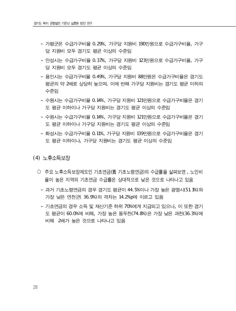 경기도 복지 균형발전 기준선 실효화 방안 연구 28 - 가평군은 수급가구비율 0.29%, 가구당 지원비 190만원으로 수급가구비율, 가구 당 지원비 모두 경기도 평균 이상의 수준임 - 안성시는 수급가구비율 0.37%, 가구당 지원비 123만원으로 수급가구비율, 가구 당 지원비 모두 경기도 평균 이상의 수준임 - 용인시는 수급가구비율 0.49%, 가구당 지원비 88만원은 수급가구비율은 경기도 평균의 약 2배로 상당히 높으며, 이에 반해 가구당 지원비는 경기도 평균 이하의 수준임 - 수원시는 수급가구비율 0.14%, 가구당 지원비 121만원으로 수급가구비율은 경기 도 평균 이하이나 가구당 지원비는 경기도 평균 이상의 수준임 - 수원시는 수급가구비율 0.14%, 가구당 지원비 121만원으로 수급가구비율은 경기 도 평균 이하이나 가구당 지원비는 경기도 평균 이상의 수준임 - 화성시는 수급가구비율 0.11%, 가구당 지원비 139만원으로 수급가구비율은 경기 도 평균 이하이나, 가구당 지원비는 경기도 평균 이상의 수준임 (4) 노후소득보장 ○ 주요 노후소득보장제도인 기초연금(舊 기초노령연금)의 수급률을 살펴보면 , 노인비 율이 높은 지역의 기초연금 수급률은 상대적으로 낮은 것으로 나타나고 있음 - 과거 기초노령연금의 경우 경기도 평균이 44.5%이나 가장 높은 광명시(51.1%)와 가장 낮은 연천군( 36.9%)의 격차는 14.2%p에 이르고 있음 - 기초연금의 경우 소득 및 재산기준 하위 70%에게 지급되고 있으나, 이 또한 경기 도 평균이 60.0%에 비해, 가장 높은 동두천(74.8%)은 가장 낮은 과천(36.3%)에 비해 2배가 높은 것으로 나타나고 있음