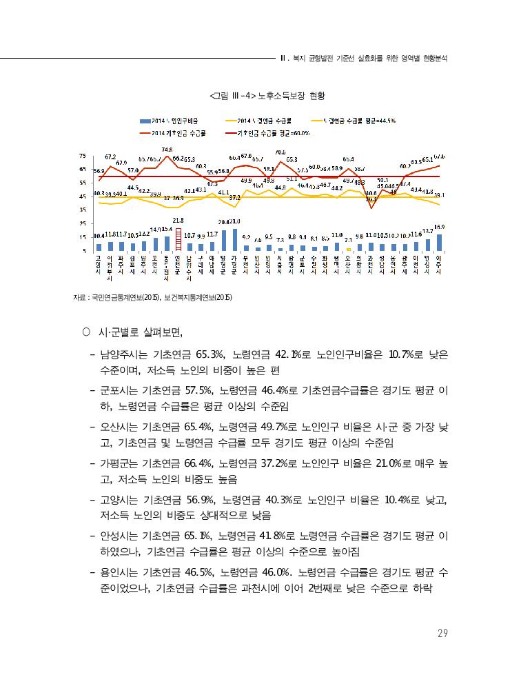 Ⅲ. 복지 균형발전 기준선 실효화를 위한 영역별 현황분석 29 <그림 Ⅲ-4> 노후소득보장 현황 자료:국민연금통계연보(2015), 보건복지통계연보(2015) ○ 시·군별로 살펴보면, - 남양주시는 기초연금 65.3%, 노령연금 42.1%로 노인인구비율은 10.7%로 낮은 수준이며, 저소득 노인의 비중이 높은 편 - 군포시는 기초연금 57.5%, 노령연금 46.4%로 기초연금수급률은 경기도 평균 이 하, 노령연금 수급률은 평균 이상의 수준임 - 오산시는 기초연금 65.4%, 노령연금 49.7%로 노인인구 비율은 시·군 중 가장 낮 고, 기초연금 및 노령연금 수급률 모두 경기도 평균 이상의 수준임 - 가평군는 기초연금 66.4%, 노령연금 37.2%로 노인인구 비율은 21.0%로 매우 높 고, 저소득 노인의 비중도 높음 - 고양시는 기초연금 56.9%, 노령연금 40.3%로 노인인구 비율은 10.4%로 낮고, 저소득 노인의 비중도 상대적으로 낮음 - 안성시는 기초연금 65.1%, 노령연금 41.8%로 노령연금 수급률은 경기도 평균 이 하였으나, 기초연금 수급률은 평균 이상의 수준으로 높아짐 - 용인시는 기초연금 46.5%, 노령연금 46.0%. 노령연금 수급률은 경기도 평균 수 준이었으나, 기초연금 수급률은 과천시에 이어 2번째로 낮은 수준으로 하락