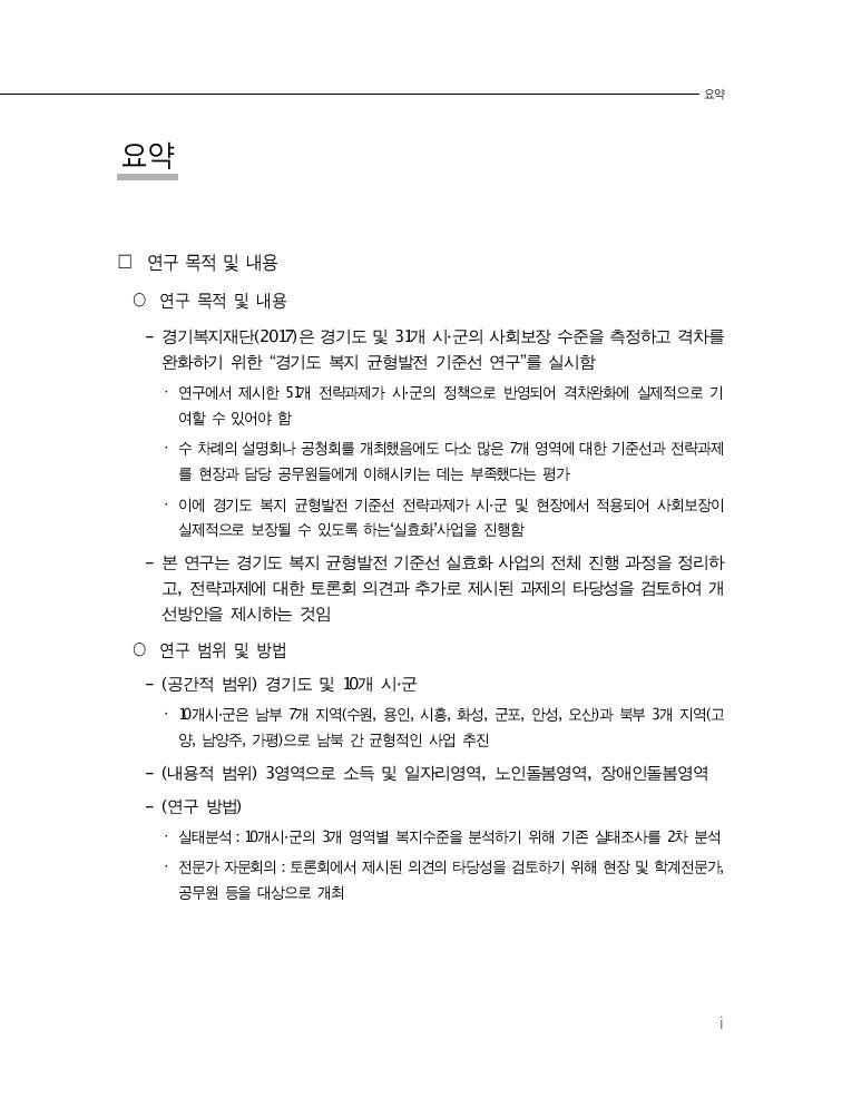 요약 i 요약 □ 연구 목적 및 내용 ○ 연구 목적 및 내용 - 경기복지재단(2017)은 경기도 및 31개 시·군의 사회보장 수준을 측정하고 격차를 완화하기 위한 “경기도 복지 균형발전 기준선 연구”를 실시함 ・ 연구에서 제시한 51개 전략과제가 시·군의 정책으로 반영되어 격차완화에 실제적으로 기 여할 수 있어야 함 ・ 수 차례의 설명회나 공청회를 개최했음에도 다소 많은 7개 영역에 대한 기준선과 전략과제 를 현장과 담당 공무원들에게 이해시키는 데는 부족했다는 평가 ・ 이에 경기도 복지 균형발전 기준선 전략과제가 시·군 및 현장에서 적용되어 사회보장이 실제적으로 보장될 수 있도록 하는‘실효화’사업을 진행함 - 본 연구는 경기도 복지 균형발전 기준선 실효화 사업의 전체 진행 과정을 정리하 고, 전략과제에 대한 토론회 의견과 추가로 제시된 과제의 타당성을 검토하여 개 선방안을 제시하는 것임 ○ 연구 범위 및 방법 - (공간적 범위) 경기도 및 10개 시·군 ・ 10개시·군은 남부 7개 지역(수원, 용인, 시흥, 화성, 군포, 안성, 오산)과 북부 3개 지역(고 양, 남양주, 가평)으로 남북 간 균형적인 사업 추진 - (내용적 범위) 3영역으로 소득 및 일자리영역, 노인돌봄영역, 장애인돌봄영역 - (연구 방법) ・ 실태분석:10개시·군의 3개 영역별 복지수준을 분석하기 위해 기존 실태조사를 2차 분석 ・ 전문가 자문회의:토론회에서 제시된 의견의 타당성을 검토하기 위해 현장 및 학계전문가, 공무원 등을 대상으로 개최
