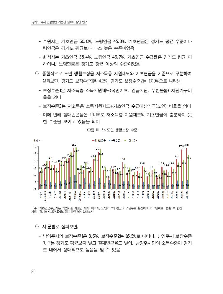 경기도 복지 균형발전 기준선 실효화 방안 연구 30 - 수원시는 기초연금 60.0%, 노령연금 45.3%. 기초연금은 경기도 평균 수준이나 령연금은 경기도 평균보다 다소 높은 수준이었음 - 화성시는 기초연금 58.4%, 노령연금 46.7%. 기초연금 수급률은 경기도 평균 이 하이나, 노령연금은 경기도 평균 이상의 수준이었음 ○ 종합적으로 도민 생활보장을 저소득층 지원제도와 기초연금을 기준으로 구분하여 살펴보면, 경기도 보장수준1은 4.2%, 경기도 보장수준2는 17.0%으로 나타남 - 보장수준1은 저소득층 소득지원제도(국민기초, 긴급지원, 무한돌봄) 지원가구비 율을 의미 - 보장수준2는 저소득층 소득지원제도+기초연금 수급대상가구(노인) 비율을 의미 - 이에 반해 절대빈곤율은 14.1%로 저소득층 지원제도와 기초연금이 충분하지 못 한 수준을 보이고 있음을 의미 <그림 Ⅲ-5> 도민 생활보장 수준 주:기초연금수급자는 개인기준 자료만 제시. 따라서, 노인가구의 평균 가구원수로 환산하여 가구단위로 변환 후 합산 자료:경기복지재단(2016), 경기도민 복지실태조사 ○ 시·군별로 살펴보면, - 남양주시의 보장수준1은 3.6%, 보장수준2는 16.5%로 나타나. 남양주시 보장수준 1, 2는 경기도 평균보다 낮고 절대빈곤율도 낮아, 남양주시민의 소득수준이 경기 도 내에서 상대적으로 높음을 알 수 있음
