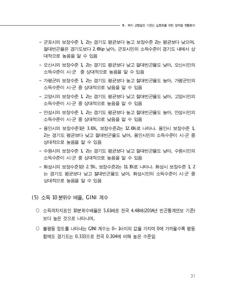 Ⅲ. 복지 균형발전 기준선 실효화를 위한 영역별 현황분석 31 - 군포시의 보장수준 1, 2는 경기도 평균보다 높고 보장수준 2는 평균보다 낮으며, 절대빈곤율은 경기도보다 2.6%p 낮아, 군포시민의 소득수준이 경기도 내에서 상 대적으로 높음을 알 수 있음 - 오산시의 보장수준 1, 2는 경기도 평균보다 낮고 절대빈곤율도 낮아, 오산시민의 소득수준이 시·군 중 상대적으로 높음을 알 수 있음 - 가평군의 보장수준 1, 2는 경기도 평균보다 높고 절대빈곤율도 높아, 가평군민의 소득수준이 시·군 중 상대적으로 낮음을 알 수 있음 - 고양시의 보장수준 1, 2는 경기도 평균보다 낮고 절대빈곤율도 낮아, 고양시민의 소득수준이 시·군 중 상대적으로 높음을 알 수 있음 - 안성시의 보장수준 1, 2는 경기도 평균보다 높고 절대빈곤율도 높아, 안성시민의 소득수준이 시·군 중 상대적으로 낮음을 알 수 있음 - 용인시의 보장수준1은 3.6%, 보장수준2는 12.6%로 나타나. 용인시 보장수준 1, 2는 경기도 평균보다 낮고 절대빈곤율도 낮아, 용인시민의 소득수준이 시·군 중 상대적으로 높음을 알 수 있음 - 수원시의 보장수준 1, 2는 경기도 평균보다 낮고 절대빈곤율도 낮아, 수원시민의 소득수준이 시·군 중 상대적으로 높음을 알 수 있음 - 화성시의 보장수준1은 2.5%, 보장수준2는 11.1%로 나타나. 화성시 보장수준 1, 2 는 경기도 평균보다 낮고 절대빈곤율도 낮아, 화성시민의 소득수준이 시·군 중 상대적으로 높음을 알 수 있음 (5) 소득 10분위수 배율, GINI 계수 ○ 소득격차지표인 10분위수배율은 5.61배로 전국 4.48배(2014년 빈곤통계연보 기준) 보다 높은 것으로 나타나며, ○ 불평등 정도를 나타내는 GINI 계수는 0~1사이의 값을 가지며 0에 가까울수록 평등 함에도 경기도는 0.333으로 전국 0.304에 비해 높은 수준임