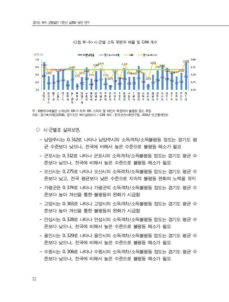 경기도 복지 균형발전 기준선 실효화 방안 연구 32 <그림 Ⅲ-6> 시·군별 소득 10분위 배율 및 GINI 계수 주:10분위수배율은 소득상위 10%가 하위 10% 소득의 몇 배인지 측정하여 불평등 정도 추정 자료:경기복지재단(2016), 경기도민 복지실태조사 / GINI 계수:한국보건사회연구원, 2014년 빈곤통계연보 ○ 시·군별로 살펴보면, - 남양주시는 0.312로 나타나 남양주시의 소득격차/소득불평등 정도는 경기도 평 균 수준보다 낮으나, 전국에 비해서 높은 수준으로 불평등 해소가 필요 - 군포시는 0.312로 나타나 군포시의 소득격차/소득불평등 정도는 경기도 평균 수 준보다 낮으나, 전국에 비해서 높은 수준으로 불평등 해소가 필요 - 오산시는 0.275로 나타나 오산시의 소득격차/소득불평등 정도는 경기도 평균 수 준보다 낮고, 전국 평균보다 낮은 수준으로 지속적 불평등 완화의 노력을 유지 - 가평군은 0.374로 나타나 가평군의 소득격차/소득불평등 정도는 경기도 평균 수 준보다 높아 개선을 통한 불평등의 완화가 시급함 - 고양시는 0.363로 나타나 고양시의 소득격차/소득불평등 정도는 경기도 평균 수 준보다 높아 개선을 통한 불평등의 완화가 시급함 - 안성시는 0.328로 나타나 안성시의 소득격차/소득불평등 정도는 경기도 평균 수 준보다 낮으나, 전국에 비해서 높은 수준으로 불평등 해소가 필요 - 용인시는 0.329로 나타나 용인시의 소득격차/소득불평등 정도는 경기도 평균 수 준보다 낮으나, 전국에 비해서 높은 수준으로 불평등 해소가 필요 - 수원시는 0.306로 나타나 수원시의 소득격차/소득불평등 정도는 경기도 평균 수 준보다 낮으나, 전국에 비해서 높은 수준으로 불평등 해소가 필요