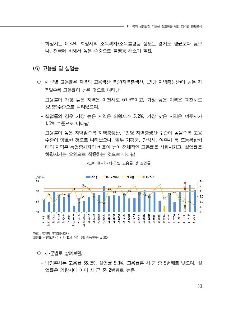 Ⅲ. 복지 균형발전 기준선 실효화를 위한 영역별 현황분석 33 - 화성시는 0.324. 화성시의 소득격차/소득불평등 정도는 경기도 평균보다 낮으 나, 전국에 비해서 높은 수준으로 불평등 해소가 필요 (6) 고용률 및 실업률 ○ 시·군별 고용률은 지역의 고용생산 역량(지역총생산, 1인당 지역총생산)이 높은 지 역일수록 고용률이 높은 것으로 나타남 - 고용률이 가장 높은 지역은 이천시로 64.3%이고, 가장 낮은 지역은 과천시로 52.9%수준으로 나타났으며, - 실업률의 경우 가장 높은 지역은 의왕시가 5.2%, 가장 낮은 지역은 여주시가 1.3% 수준으로 나타남 - 고용률이 높은 지역일수록 지역총생산, 1인당 지역총생산 수준이 높을수록 고용 수준이 양호한 것으로 나타났으나, 일부 가평군, 안성시, 여주시 등 도농복합형 태의 지역은 농업종사자의 비율이 높아 전체적인 고용률을 상향시키고, 실업률을 하향시키는 요인으로 작용하는 것으로 나타남 <그림 Ⅲ-7> 시·군별 고용률 및 실업률 자료:통계청 경제활동조사 고용률 = (취업자수 / 만 15세 이상 생산가능인구) x 100 ○ 시·군별로 살펴보면, - 남양주시는 고용률 55.3%, 실업률 5.1%. 고용률은 시·군 중 5번째로 낮으며, 실 업률은 의왕시에 이어 시·군 중 2번째로 높음