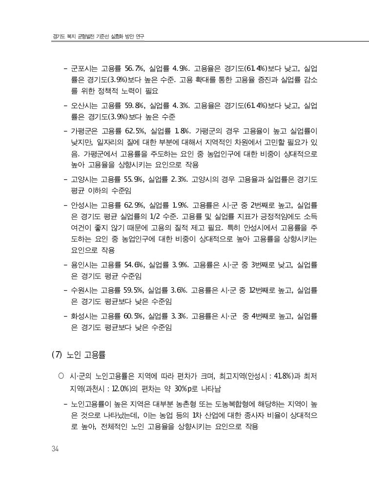 경기도 복지 균형발전 기준선 실효화 방안 연구 34 - 군포시는 고용률 56.7%, 실업률 4.9%. 고용율은 경기도(61.4%)보다 낮고, 실업 률은 경기도(3.9%)보다 높은 수준. 고용 확대를 통한 고용율 증진과 실업률 감소 를 위한 정책적 노력이 필요 - 오산시는 고용률 59.8%, 실업률 4.3%. 고용율은 경기도(61.4%)보다 낮고, 실업 률은 경기도(3.9%)보다 높은 수준 - 가평군은 고용률 62.5%, 실업률 1.8%. 가평군의 경우 고용율이 높고 실업률이 낮지만, 일자리의 질에 대한 부분에 대해서 지역적인 차원에서 고민할 필요가 있 음. 가평군에서 고용률을 주도하는 요인 중 농업인구에 대한 비중이 상대적으로 높아 고용율을 상향시키는 요인으로 작용 - 고양시는 고용률 55.9%, 실업률 2.3%. 고양시의 경우 고용율과 실업률은 경기도 평균 이하의 수준임 - 안성시는 고용률 62.9%, 실업률 1.9%. 고용률은 시·군 중 2번째로 높고, 실업률 은 경기도 평균 실업률의 1/2 수준. 고용률 및 실업률 지표가 긍정적임에도 소득 여건이 좋지 않기 때문에 고용의 질적 제고 필요. 특히 안성시에서 고용률을 주 도하는 요인 중 농업인구에 대한 비중이 상대적으로 높아 고용률을 상향시키는 요인으로 작용 - 용인시는 고용률 54.6%, 실업률 3.9%. 고용률은 시·군 중 3번째로 낮고, 실업률 은 경기도 평균 수준임 - 수원시는 고용률 59.5%, 실업률 3.6%. 고용률은 시·군 중 12번째로 높고, 실업률 은 경기도 평균보다 낮은 수준임 - 화성시는 고용률 60.5%, 실업률 3.3%. 고용률은 시·군 중 4번째로 높고, 실업률 은 경기도 평균보다 낮은 수준임 (7) 노인 고용률 ○ 시·군의 노인고용률은 지역에 따라 편차가 크며, 최고지역(안성시:41.8%)과 최저 지역(과천시:12.0%)의 편차는 약 30%p로 나타남 - 노인고용률이 높은 지역은 대부분 농촌형 또는 도농복합형에 해당하는 지역이 높 은 것으로 나타났는데, 이는 농업 등의 1차 산업에 대한 종사자 비율이 상대적으 로 높아, 전체적인 노인 고용율을 상향시키는 요인으로 작용