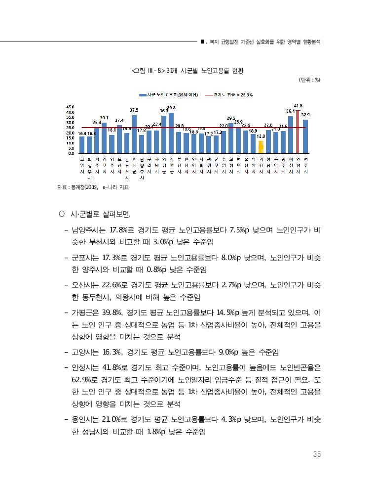 Ⅲ. 복지 균형발전 기준선 실효화를 위한 영역별 현황분석 35 자료:통계청(2016), e-나라 지표 <그림 Ⅲ-8> 31개 시․군별 노인고용률 현황 (단위:%) ○ 시·군별로 살펴보면, - 남양주시는 17.8%로 경기도 평균 노인고용률보다 7.5%p 낮으며 노인인구가 비 슷한 부천시와 비교할 때 3.0%p 낮은 수준임 - 군포시는 17.3%로 경기도 평균 노인고용률보다 8.0%p 낮으며, 노인인구가 비슷 한 양주시와 비교할 때 0.8%p 낮은 수준임 - 오산시는 22.6%로 경기도 평균 노인고용률보다 2.7%p 낮으며, 노인인구가 비슷 한 동두천시, 의왕시에 비해 높은 수준임 - 가평군은 39.8%, 경기도 평균 노인고용률보다 14.5%p 높게 분석되고 있으며, 이 는 노인 인구 중 상대적으로 농업 등 1차 산업종사비율이 높아, 전체적인 고용을 상향에 영향을 미치는 것으로 분석 - 고양시는 16.3%, 경기도 평균 노인고용률보다 9.0%p 높은 수준임 - 안성시는 41.8%로 경기도 최고 수준이며, 노인고용률이 높음에도 노인빈곤율은 62.9%로 경기도 최고 수준이기에 노인일자리 임금수준 등 질적 접근이 필요. 또 한 노인 인구 중 상대적으로 농업 등 1차 산업종사비율이 높아, 전체적인 고용을 상향에 영향을 미치는 것으로 분석 - 용인시는 21.0%로 경기도 평균 노인고용률보다 4.3%p 낮으며, 노인인구가 비슷 한 성남시와 비교할 때 1.8%p 낮은 수준임