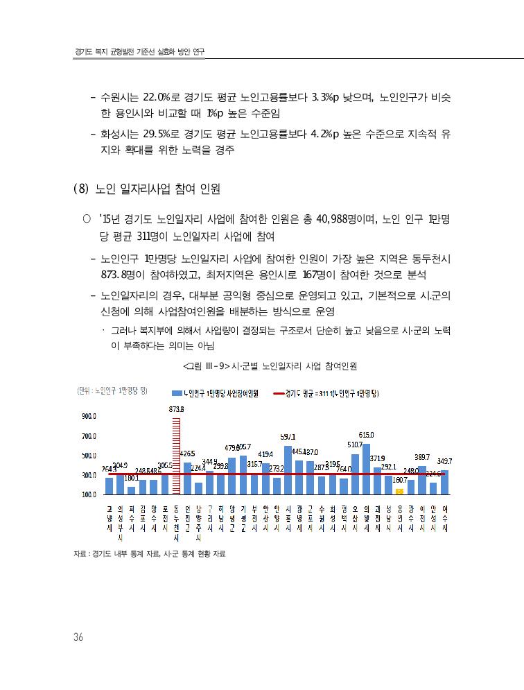 경기도 복지 균형발전 기준선 실효화 방안 연구 36 - 수원시는 22.0%로 경기도 평균 노인고용률보다 3.3%p 낮으며, 노인인구가 비슷 한 용인시와 비교할 때 1%p 높은 수준임 - 화성시는 29.5%로 경기도 평균 노인고용률보다 4.2%p 높은 수준으로 지속적 유 지와 확대를 위한 노력을 경주 (8) 노인 일자리사업 참여 인원 ○ ’15년 경기도 노인일자리 사업에 참여한 인원은 총 40,988명이며, 노인 인구 1만명 당 평균 311명이 노인일자리 사업에 참여 - 노인인구 1만명당 노인일자리 사업에 참여한 인원이 가장 높은 지역은 동두천시 873.8명이 참여하였고, 최저지역은 용인시로 167명이 참여한 것으로 분석 - 노인일자리의 경우, 대부분 공익형 중심으로 운영되고 있고, 기본적으로 시․군의 신청에 의해 사업참여인원을 배분하는 방식으로 운영 ・ 그러나 복지부에 의해서 사업량이 결정되는 구조로서 단순히 높고 낮음으로 시·군의 노력 이 부족하다는 의미는 아님 <그림 Ⅲ-9> 시·군별 노인일자리 사업 참여인원 자료:경기도 내부 통계 자료, 시·군 통계 현황 자료