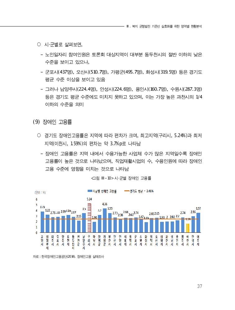 Ⅲ. 복지 균형발전 기준선 실효화를 위한 영역별 현황분석 37 ○ 시·군별로 살펴보면, - 노인일자리 참여인원은 토론회 대상지역이 대부분 동두천시의 절반 이하의 낮은 수준을 보이고 있으나, - 군포시(437명), 오산시(510.7명), 가평군(495.7명), 화성시(319.5명) 등은 경기도 평균 수준 이상을 보이고 있음 - 그러나 남양주시(224.4명), 안성시(224.6명), 용인시(160.7명), 수원시(287.3명) 등은 경기도 평균 수준에도 미치지 못하고 있으며, 이는 가장 높은 과천시의 1/4 이하의 수준을 의미 (9) 장애인 고용률 ○ 경기도 장애인고용률은 지역에 따라 편차가 크며, 최고지역(구리시, 5.24%)과 최저 지역(이천시, 1.59%)의 편차는 약 3.7%p로 나타남 - 장애인 고용률은 지역 내에서 수용가능한 사업체 수가 많은 지역일수록 장애인 고용률이 높은 것으로 나타났으며, 직업재활시업의 수, 수용인원에 따라 장애인 고용 수준에 영향을 미치는 것으로 나타남 <그림 Ⅲ-10> 시·군별 장애인 고용률 자료:한국장애인고용공단(2014). 장애인고용 실태조사