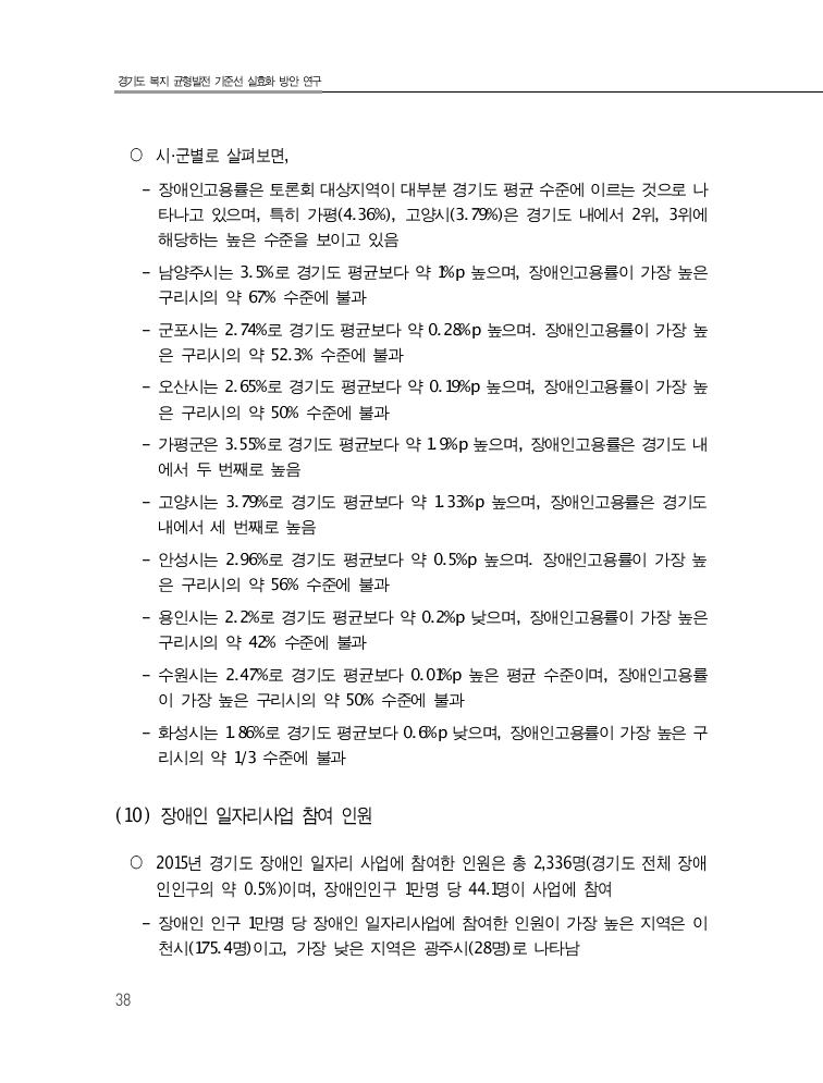 경기도 복지 균형발전 기준선 실효화 방안 연구 38 ○ 시·군별로 살펴보면, - 장애인고용률은 토론회 대상지역이 대부분 경기도 평균 수준에 이르는 것으로 나 타나고 있으며, 특히 가평(4.36%), 고양시(3.79%)은 경기도 내에서 2위, 3위에 해당하는 높은 수준을 보이고 있음 - 남양주시는 3.5%로 경기도 평균보다 약 1%p 높으며, 장애인고용률이 가장 높은 구리시의 약 67% 수준에 불과 - 군포시는 2.74%로 경기도 평균보다 약 0.28%p 높으며. 장애인고용률이 가장 높 은 구리시의 약 52.3% 수준에 불과 - 오산시는 2.65%로 경기도 평균보다 약 0.19%p 높으며, 장애인고용률이 가장 높 은 구리시의 약 50% 수준에 불과 - 가평군은 3.55%로 경기도 평균보다 약 1.9%p 높으며, 장애인고용률은 경기도 내 에서 두 번째로 높음 - 고양시는 3.79%로 경기도 평균보다 약 1.33%p 높으며, 장애인고용률은 경기도 내에서 세 번째로 높음 - 안성시는 2.96%로 경기도 평균보다 약 0.5%p 높으며. 장애인고용률이 가장 높 은 구리시의 약 56% 수준에 불과 - 용인시는 2.2%로 경기도 평균보다 약 0.2%p 낮으며, 장애인고용률이 가장 높은 구리시의 약 42% 수준에 불과 - 수원시는 2.47%로 경기도 평균보다 0.01%p 높은 평균 수준이며, 장애인고용률 이 가장 높은 구리시의 약 50% 수준에 불과 - 화성시는 1.86%로 경기도 평균보다 0.6%p 낮으며, 장애인고용률이 가장 높은 구 리시의 약 1/3 수준에 불과 (10) 장애인 일자리사업 참여 인원 ○ 2015년 경기도 장애인 일자리 사업에 참여한 인원은 총 2,336명(경기도 전체 장애 인인구의 약 0.5%)이며, 장애인인구 1만명 당 44.1명이 사업에 참여 - 장애인 인구 1만명 당 장애인 일자리사업에 참여한 인원이 가장 높은 지역은 이 천시(175.4명)이고, 가장 낮은 지역은 광주시(28명)로 나타남