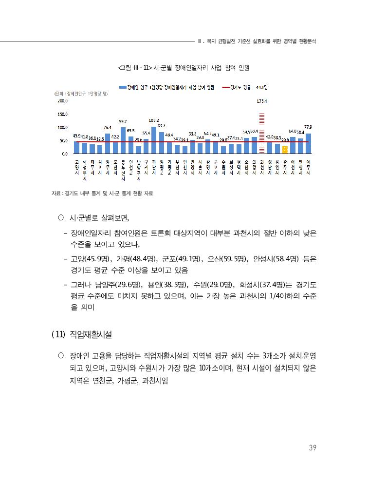 Ⅲ. 복지 균형발전 기준선 실효화를 위한 영역별 현황분석 39 <그림 Ⅲ-11> 시·군별 장애인일자리 사업 참여 인원 자료:경기도 내부 통계 및 시·군 통계 현황 자료 ○ 시·군별로 살펴보면, - 장애인일자리 참여인원은 토론회 대상지역이 대부분 과천시의 절반 이하의 낮은 수준을 보이고 있으나, - 고양(45.9명), 가평(48.4명), 군포(49.1명), 오산(59.5명), 안성시(58.4명) 등은 경기도 평균 수준 이상을 보이고 있음 - 그러나 남양주(29.6명), 용인(38.5명), 수원(29.0명), 화성시(37.4명)는 경기도 평균 수준에도 미치지 못하고 있으며, 이는 가장 높은 과천시의 1/4이하의 수준 을 의미 (11) 직업재활시설 ○ 장애인 고용을 담당하는 직업재활시설의 지역별 평균 설치 수는 3개소가 설치․운영 되고 있으며, 고양시와 수원시가 가장 많은 10개소이며, 현재 시설이 설치되지 않은 지역은 연천군, 가평군, 과천시임