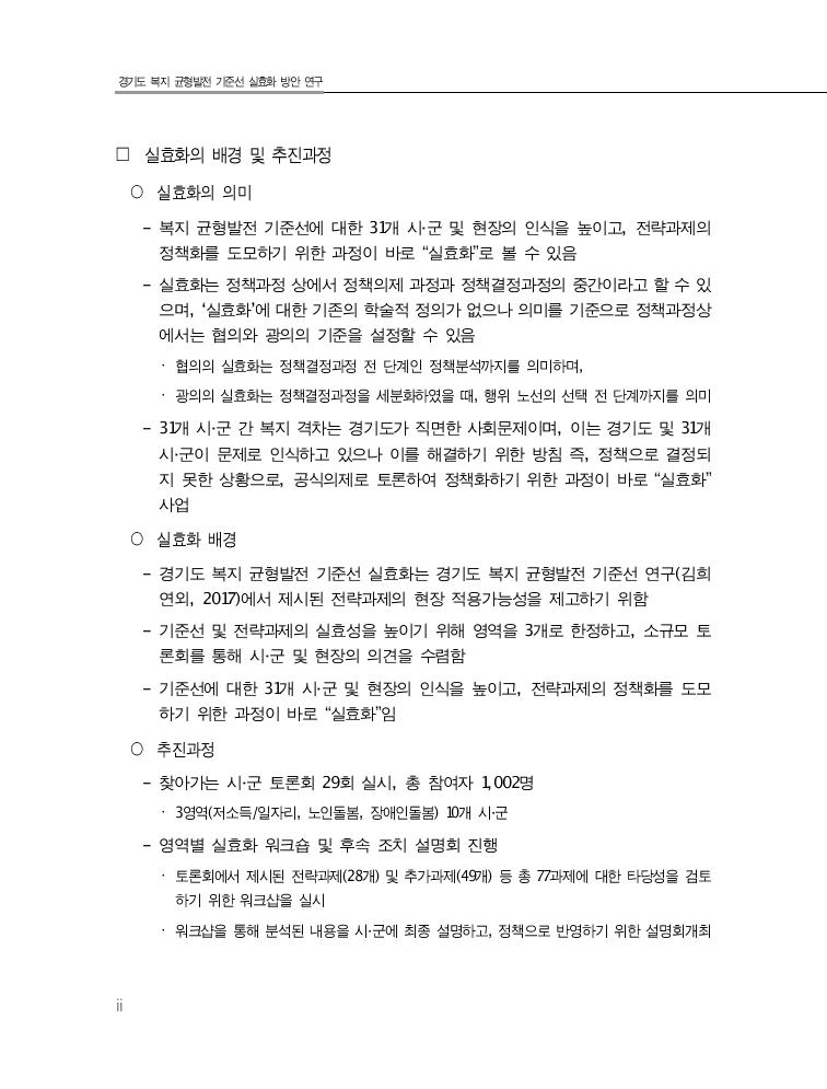 경기도 복지 균형발전 기준선 실효화 방안 연구 ii □ 실효화의 배경 및 추진과정 ○ 실효화의 의미 - 복지 균형발전 기준선에 대한 31개 시·군 및 현장의 인식을 높이고, 전략과제의 정책화를 도모하기 위한 과정이 바로 “실효화”로 볼 수 있음 - 실효화는 정책과정 상에서 정책의제 과정과 정책결정과정의 중간이라고 할 수 있 으며, ‘실효화’에 대한 기존의 학술적 정의가 없으나 의미를 기준으로 정책과정상 에서는 협의와 광의의 기준을 설정할 수 있음 ・ 협의의 실효화는 정책결정과정 전 단계인 정책분석까지를 의미하며, ・ 광의의 실효화는 정책결정과정을 세분화하였을 때, 행위 노선의 선택 전 단계까지를 의미 - 31개 시·군 간 복지 격차는 경기도가 직면한 사회문제이며, 이는 경기도 및 31개 시·군이 문제로 인식하고 있으나 이를 해결하기 위한 방침 즉, 정책으로 결정되 지 못한 상황으로, 공식의제로 토론하여 정책화하기 위한 과정이 바로 “실효화” 사업 ○ 실효화 배경 - 경기도 복지 균형발전 기준선 실효화는 경기도 복지 균형발전 기준선 연구(김희 연외, 2017)에서 제시된 전략과제의 현장 적용가능성을 제고하기 위함 - 기준선 및 전략과제의 실효성을 높이기 위해 영역을 3개로 한정하고, 소규모 토 론회를 통해 시·군 및 현장의 의견을 수렴함 - 기준선에 대한 31개 시·군 및 현장의 인식을 높이고, 전략과제의 정책화를 도모 하기 위한 과정이 바로 “실효화”임 ○ 추진과정 - 찾아가는 시·군 토론회 29회 실시, 총 참여자 1,002명 ・ 3영역(저소득/일자리, 노인돌봄, 장애인돌봄) 10개 시·군 - 영역별 실효화 워크숍 및 후속 조치 설명회 진행 ・ 토론회에서 제시된 전략과제(28개) 및 추가과제(49개) 등 총 77과제에 대한 타당성을 검토 하기 위한 워크샵을 실시 ・ 워크샵을 통해 분석된 내용을 시·군에 최종 설명하고, 정책으로 반영하기 위한 설명회개최
