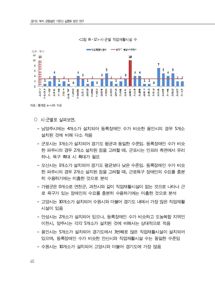 경기도 복지 균형발전 기준선 실효화 방안 연구 40 <그림 Ⅲ-12> 시·군별 직업재활시설 수 자료:통계청 e-나라 지표 ○ 시·군별로 살펴보면, - 남양주시에는 4개소가 설치되어 등록장애인 수가 비슷한 용인시의 경우 5개소 설치된 것에 비해 다소 적음 - 군포시는 3개소가 설치되어 경기도 평균과 동일한 수준임. 등록장애인 수가 비슷 한 파주시의 경우 2개소 설치된 점을 고려할 때, 군포시는 인프라 측면에서 유리 하나, 욕구 확대 시 확대가 필요 - 오산시는 1개소가 설치되어 경기도 평균보다 낮은 수준임. 등록장애인 수가 비슷 한 파주시의 경우 2개소 설치된 점을 고려할 때, 근로욕구 장애인의 수요를 충분 히 수용하기에는 미흡한 것으로 분석 - 가평군은 0개소로 연천군, 과천시와 같이 직업재활시설이 없는 것으로 나타나 근 로 욕구가 있는 장애인의 수요를 충분히 수용하기에는 미흡한 것으로 분석 - 고양시는 10개소가 설치되어 수원시와 더불어 경기도 내에서 가장 많은 직업재활 시설이 있음 - 안성시는 2개소가 설치되어 있으나, 등록장애인 수가 비슷하고 도농복합 지역인 이천시, 양주시는 각각 5개소가 설치된 것에 비해서는 상대적으로 적음 - 용인시는 5개소가 설치되어 경기도에서 3번째로 많은 직업재활시설이 설치되어 있으며, 등록장애인 수가 비슷한 안산시와 직업재활시설 수는 동일한 수준임 - 수원시는 10개소가 설치되어 고양시와 더불어 경기도에 가장 많음