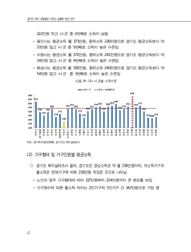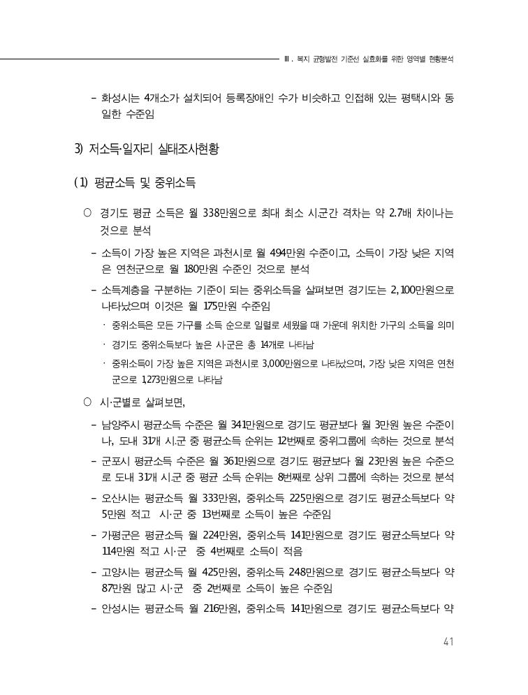 Ⅲ. 복지 균형발전 기준선 실효화를 위한 영역별 현황분석 41 - 화성시는 4개소가 설치되어 등록장애인 수가 비슷하고 인접해 있는 평택시와 동 일한 수준임 3) 저소득·일자리 실태조사현황 (1) 평균소득 및 중위소득 ○ 경기도 평균 소득은 월 338만원으로 최대 최소 시․군간 격차는 약 2.7배 차이나는 것으로 분석 - 소득이 가장 높은 지역은 과천시로 월 494만원 수준이고, 소득이 가장 낮은 지역 은 연천군으로 월 180만원 수준인 것으로 분석 - 소득계층을 구분하는 기준이 되는 중위소득을 살펴보면 경기도는 2,100만원으로 나타났으며 이것은 월 175만원 수준임 ・ 중위소득은 모든 가구를 소득 순으로 일렬로 세웠을 때 가운데 위치한 가구의 소득을 의미 ・ 경기도 중위소득보다 높은 시·군은 총 14개로 나타남 ・ 중위소득이 가장 높은 지역은 과천시로 3,000만원으로 나타났으며, 가장 낮은 지역은 연천 군으로 1,273만원으로 나타남 ○ 시·군별로 살펴보면, - 남양주시 평균소득 수준은 월 341만원으로 경기도 평균보다 월 3만원 높은 수준이 나, 도내 31개 시․군 중 평균소득 순위는 12번째로 중위그룹에 속하는 것으로 분석 - 군포시 평균소득 수준은 월 361만원으로 경기도 평균보다 월 23만원 높은 수준으 로 도내 31개 시․군 중 평균 소득 순위는 8번째로 상위 그룹에 속하는 것으로 분석 - 오산시는 평균소득 월 333만원, 중위소득 225만원으로 경기도 평균소득보다 약 5만원 적고 시·군 중 13번째로 소득이 높은 수준임 - 가평군은 평균소득 월 224만원, 중위소득 141만원으로 경기도 평균소득보다 약 114만원 적고 시·군 중 4번째로 소득이 적음 - 고양시는 평균소득 월 425만원, 중위소득 248만원으로 경기도 평균소득보다 약 87만원 많고 시·군 중 2번째로 소득이 높은 수준임 - 안성시는 평균소득 월 216만원, 중위소득 141만원으로 경기도 평균소득보다 약